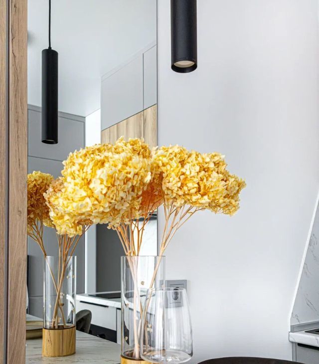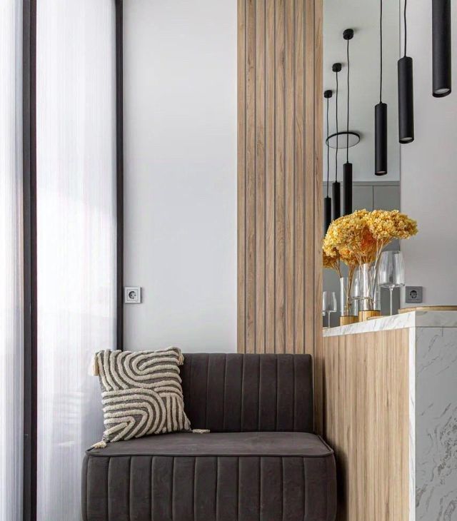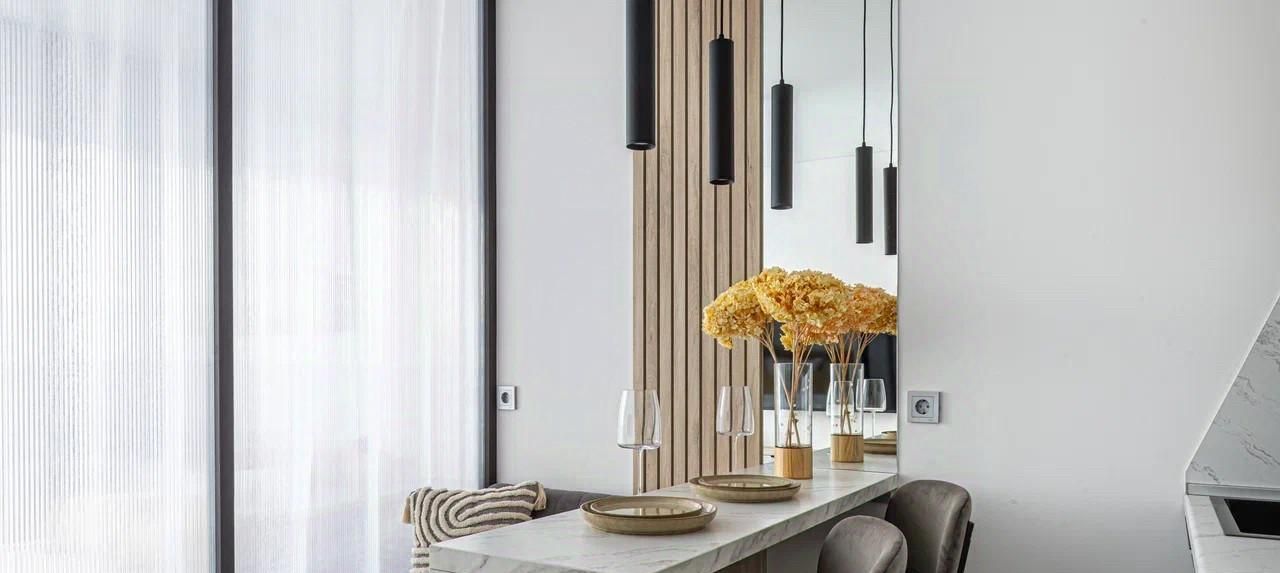 В интерьере использованы качественные натуральные материалы, создающие уютную и благородную атмосферу. А панорамные окна и 3-х метровые потолки создают дополнительное пространство и ощущение простора.