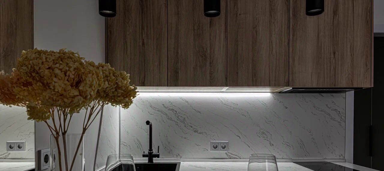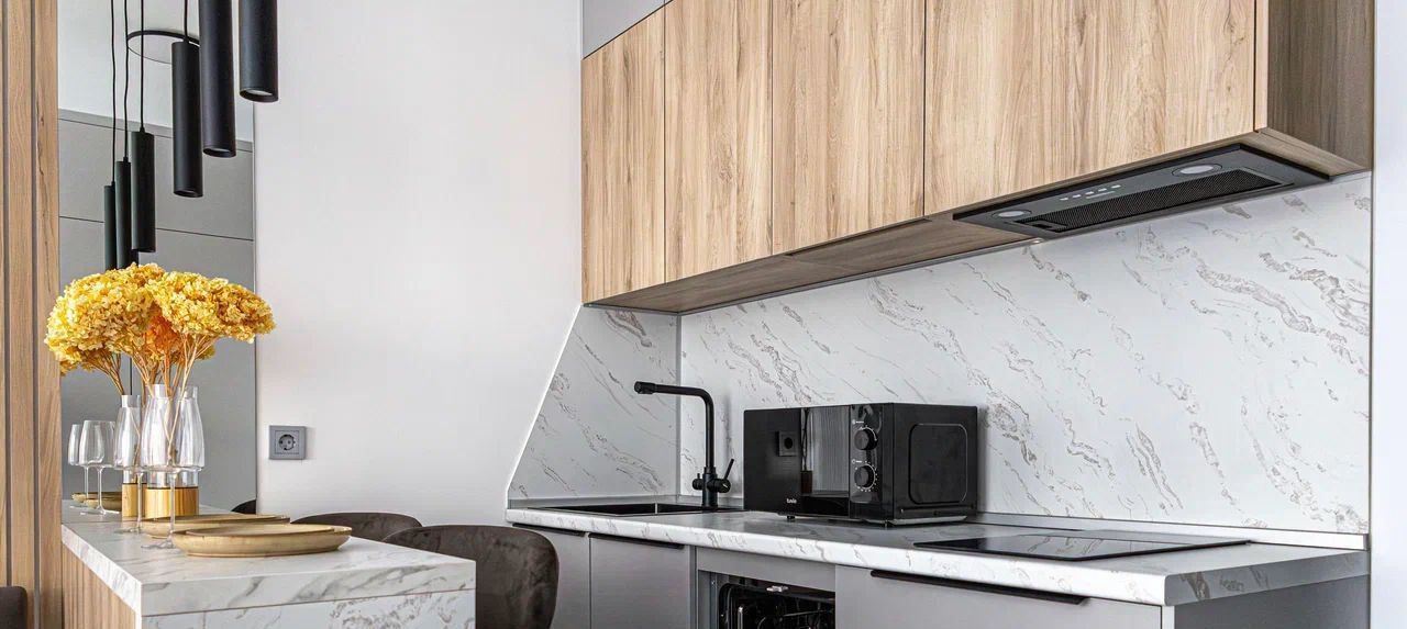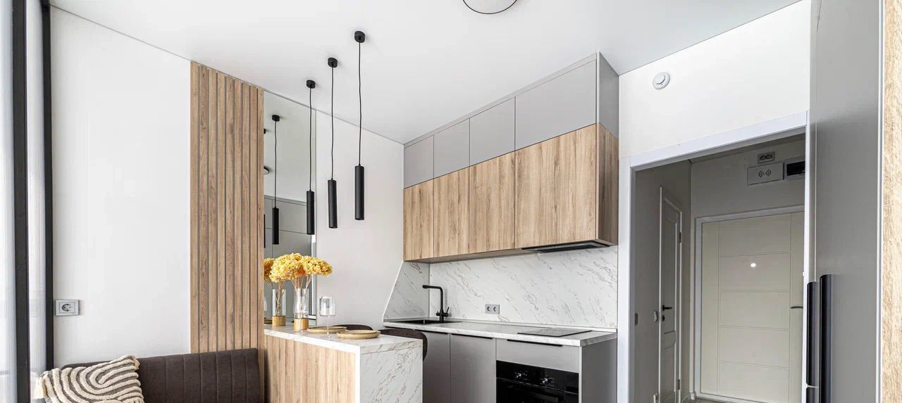 Функциональная кухня-гостиная с техникой (посудомойка, варочная панель, микроволновка, духовой шкаф, встроенный холодильник, вытяжка), компактный диван и стильная барная стойка. Установлен кондиционер, равномерно распределяющий прохладу по всей площади, и телевизор с выходом в интернет.