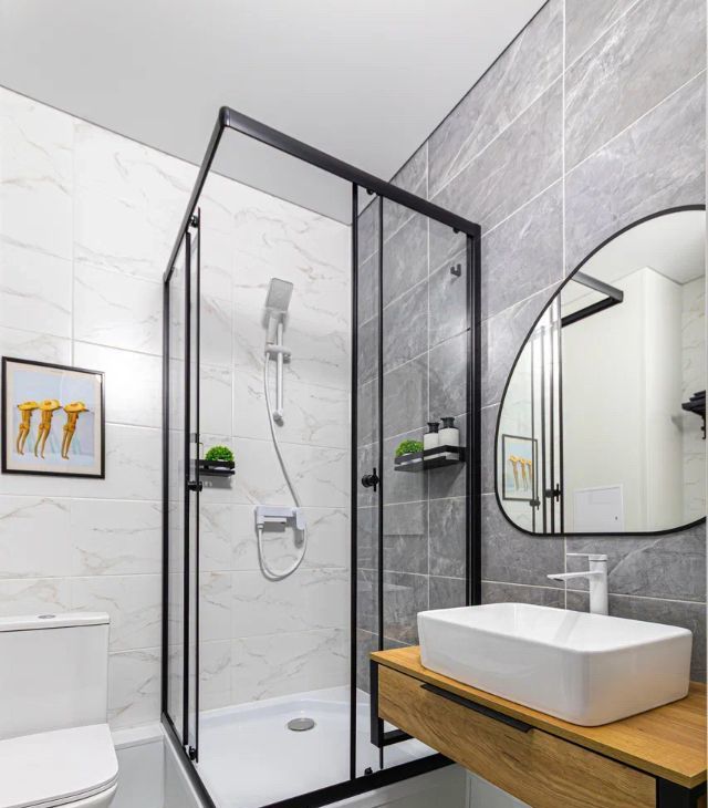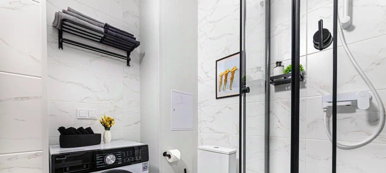 Просторная душевая кабина, стиральная машина с функцией сушки, теплый пол для вашего комфорта.