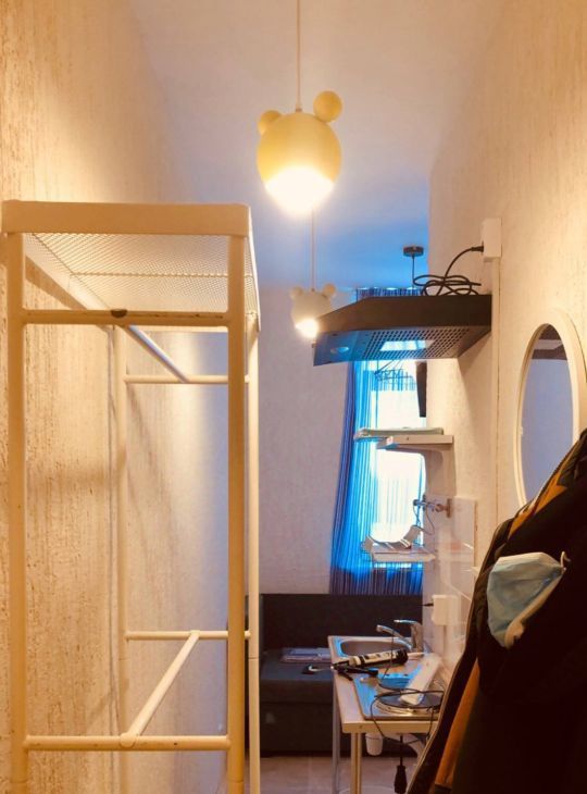 Спальные места: раскладывающийся диван, внутри ящики для хранения; различные вешалки для хранения одежды; шкаф; кухонный блок
