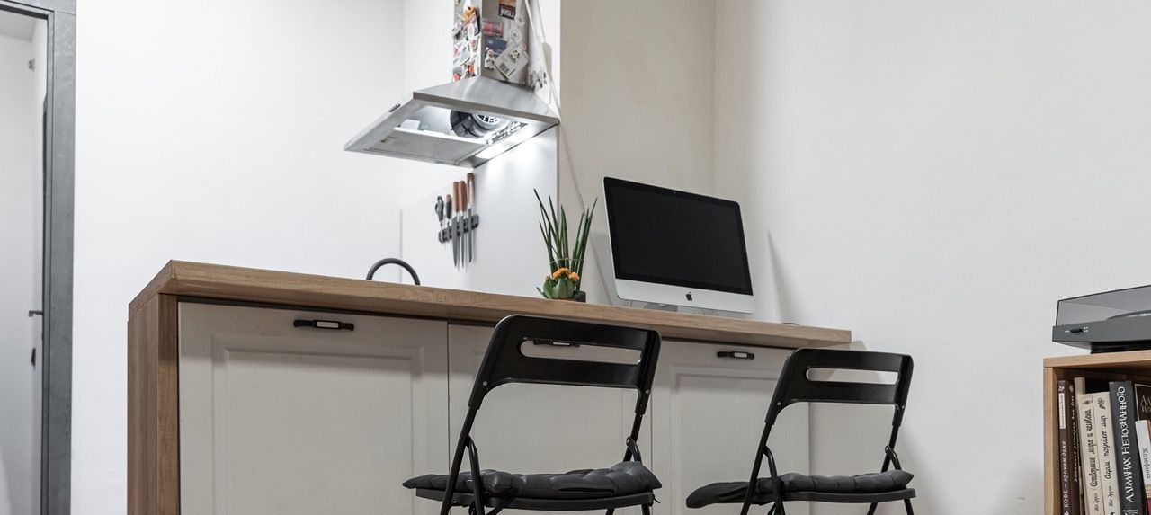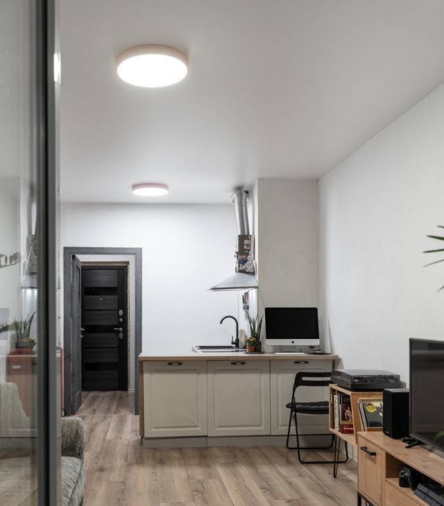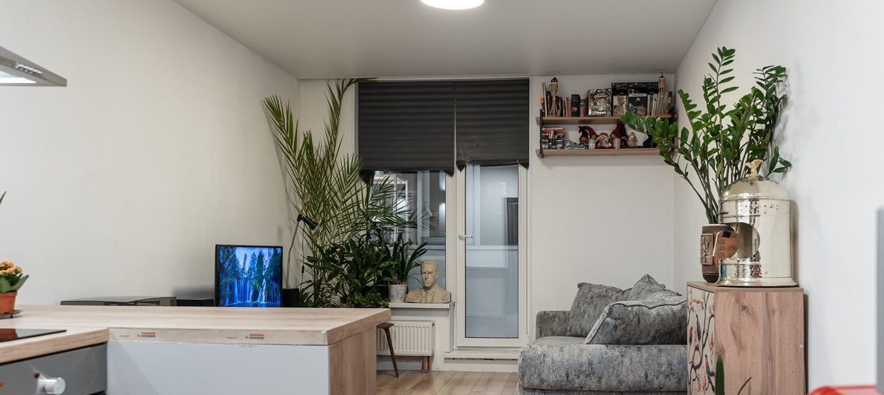 Планировка удачная и просторная - студия не ощущается маленькой, есть продуманное зонирование и много мест для хранения. Большой застеклённый балкон. Квартира полностью готова к жизни - заезжай и живи, без дополнительных вложений.