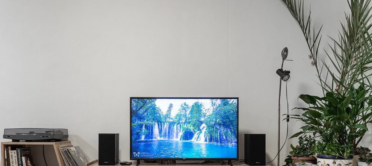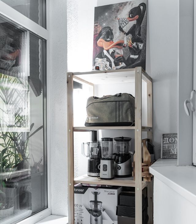 компьютера, винилового проигрывателя, кофемашины и цветов.
