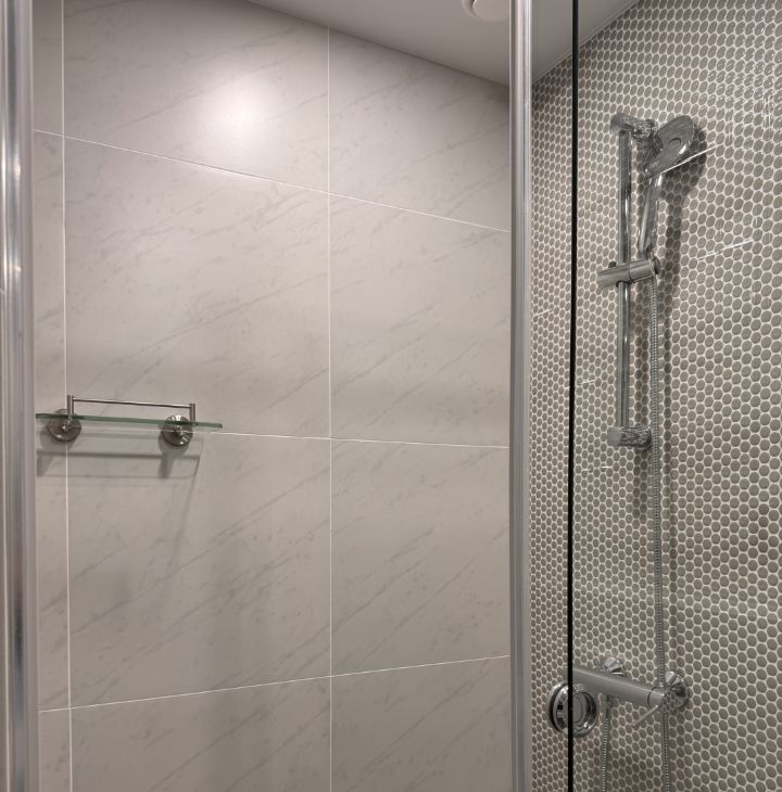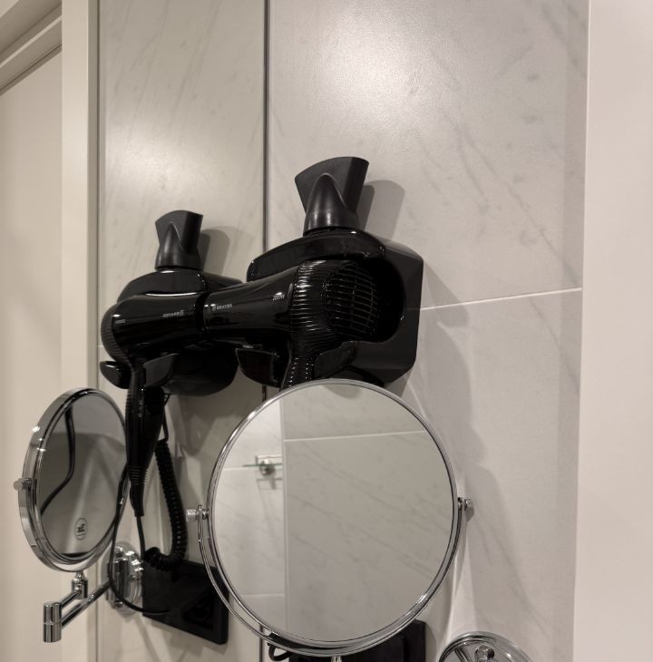 - современный санузел с душем, фен