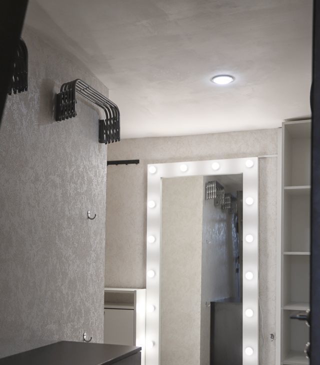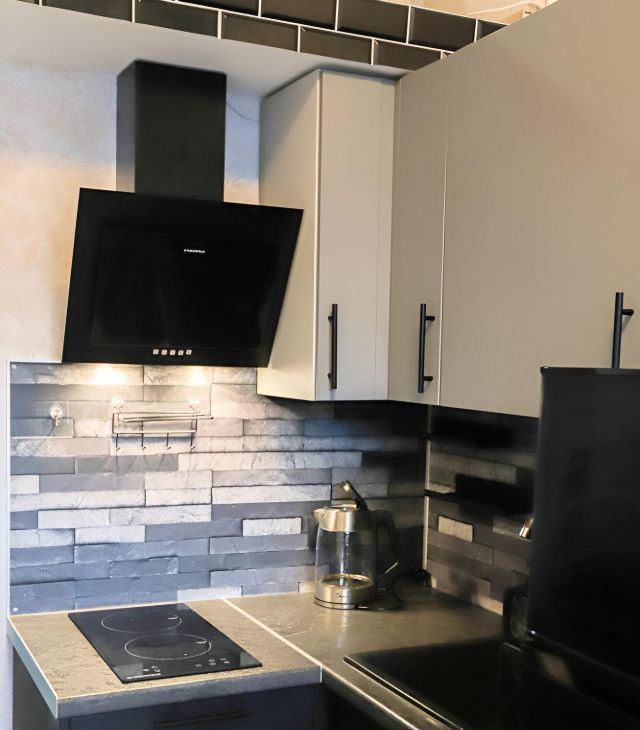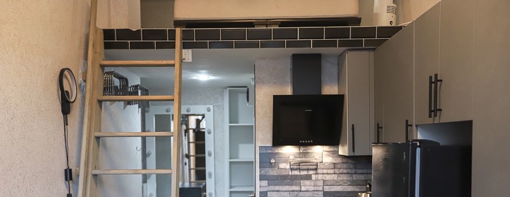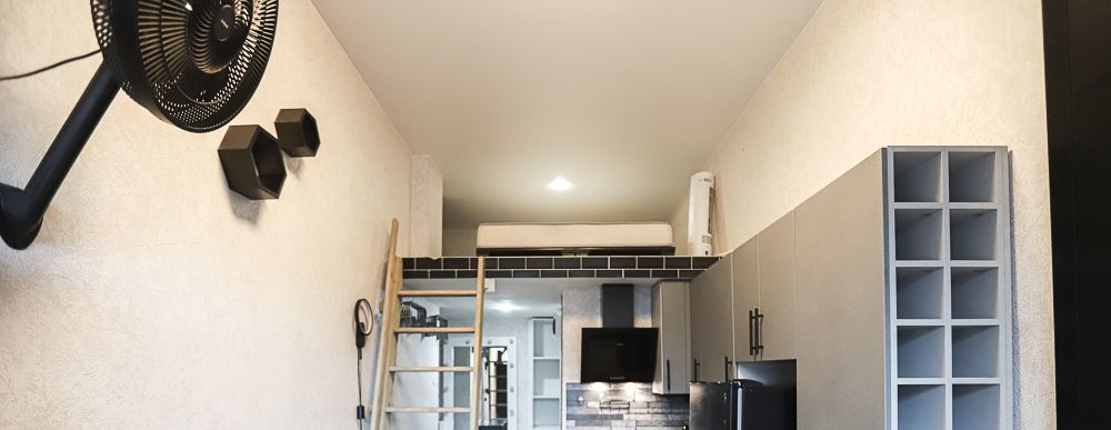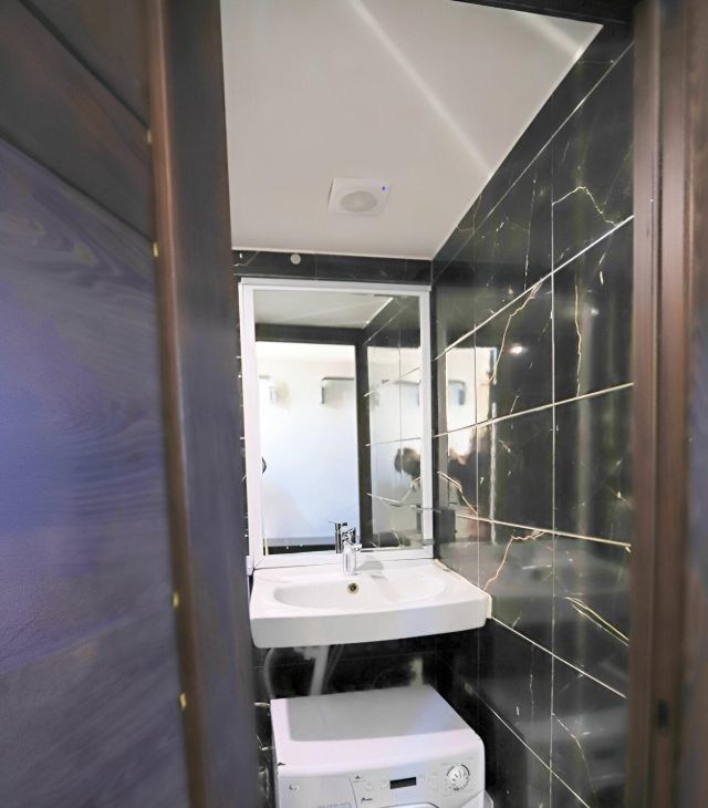 Площадь по полу 15 метров, плюс второй этаж. Оснащена техникой: индукционная плита, вытяжка, стиральная машина, бойлер на время отключения горячей воды. Много источников света.
