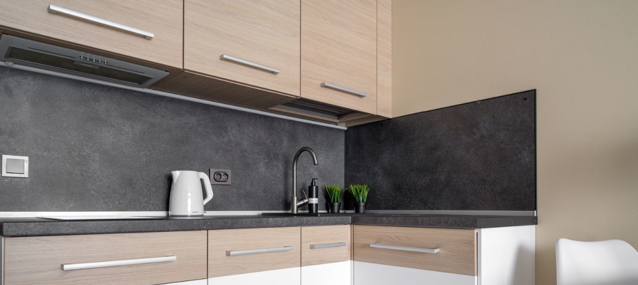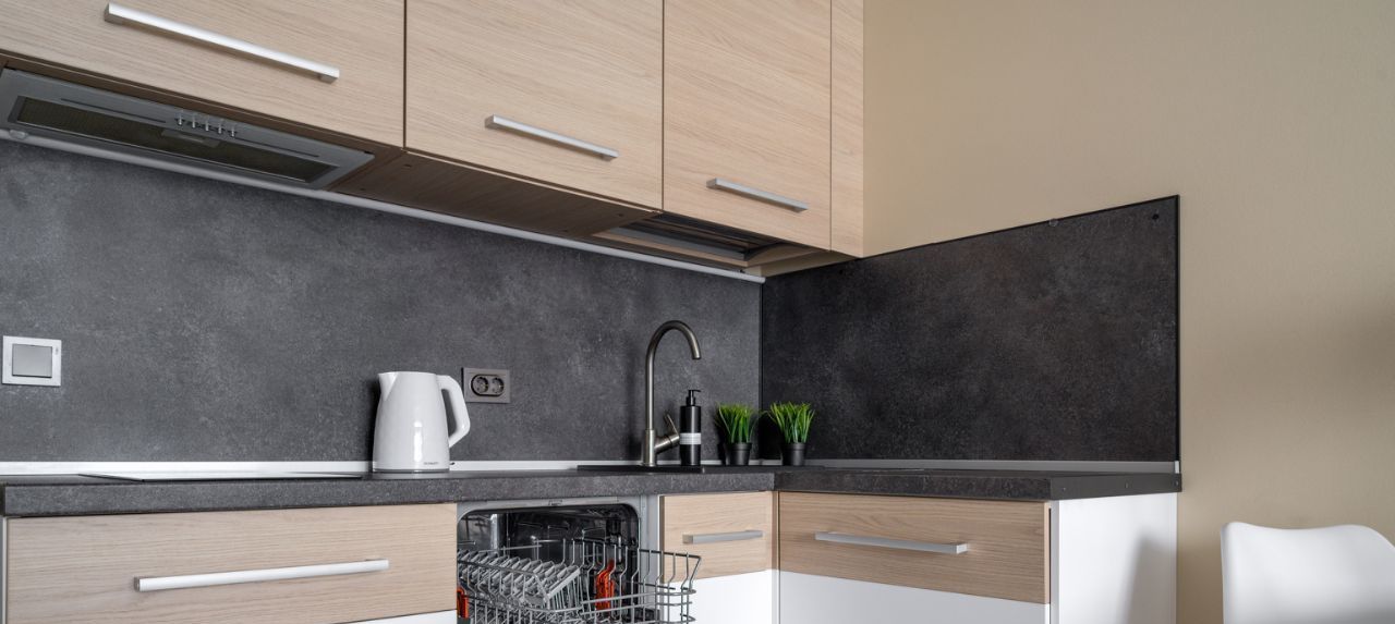 Полностью оборудованный кухонный гарнитур с электрическим чайником, микроволновкой, посудомоечной машинкой и всей необходимой посудой для приготовления, обеденный стол и стулья;