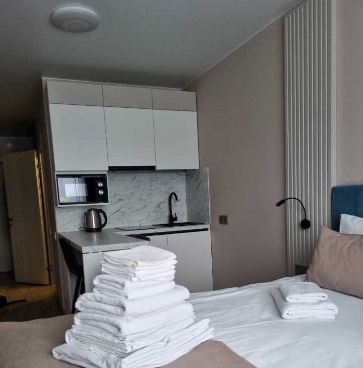 Все необходимое для проживания имеется: стиральная машина, телевизор, микроволновая печь, холодильник, посуда, утюг и т.д.