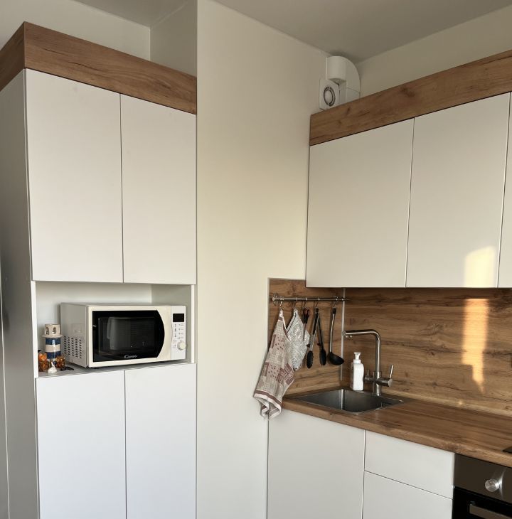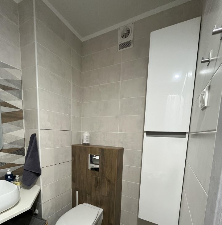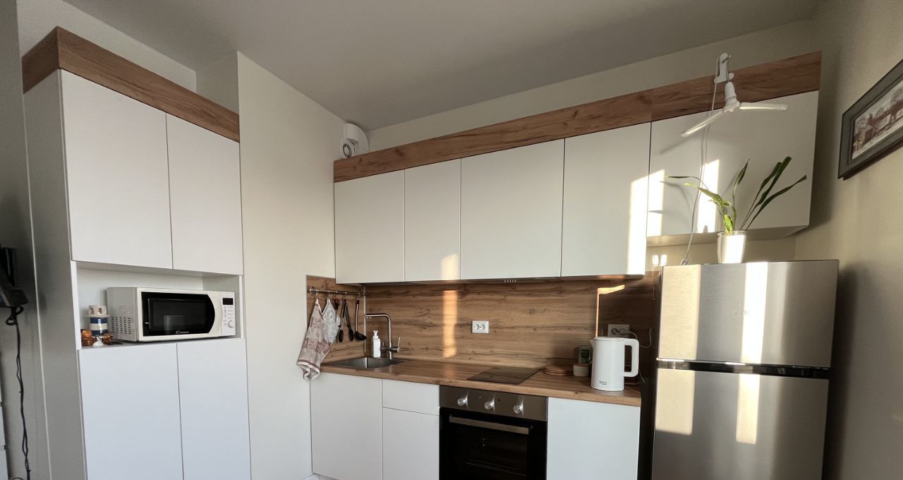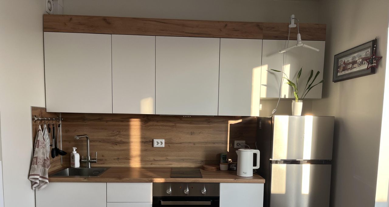 Продается уютная студия с современным ремонтом в монолитно-кирпичном доме 2021 года постройки. Кухня оборудована всем необходимым: холодильник, микроволновая печь, индукционная плита, вытяжка.
