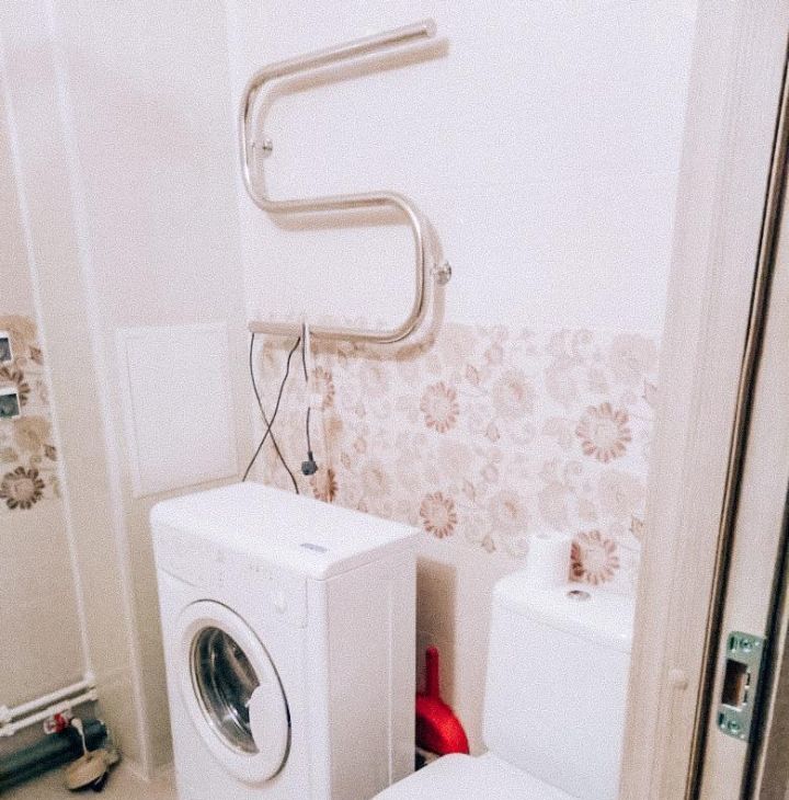 -в ванной комнате: ванна вместо душевой, стиральная машина, навесной шкафчик с зеркалом.