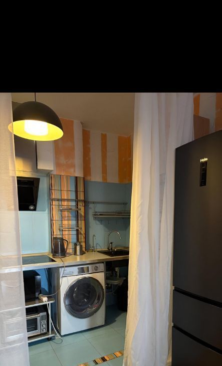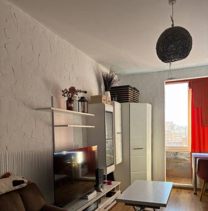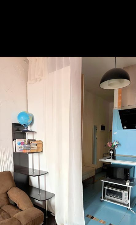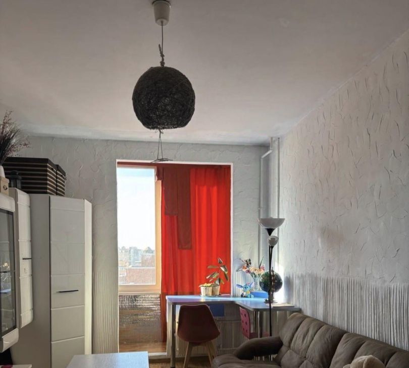 Зона кухни отгорожена тюлем плотым , балкон совмещен с основным пространством, за счет этого квартира очень светлая. Балкон утеплен, в холодное время квартира очень теплая. В теплое время квартира шикарно проветривается. 15 этаж - вид на небо, а не окна в окна.