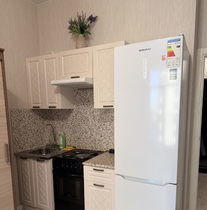 Практичная Кухня: 2 яруса, рабочая зона, плита электрическая с духовкой, вытяжка , холодильник двухкамерный с системой No Frost, надёжный смеситель. Много полок и ящиков позволят разместить всю необходимую посуду и не только.