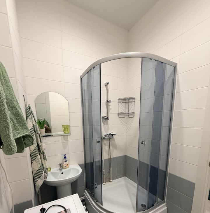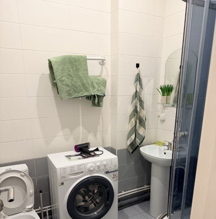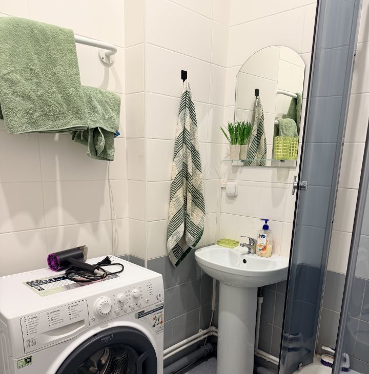 Ванная комната: стиральная машина с отсрочкой стирки в разных режимах (можно стирать ночью, она будет тихо работать и экономить киловатты), душевая кабина с тонированными стёклами, средства для уборки.