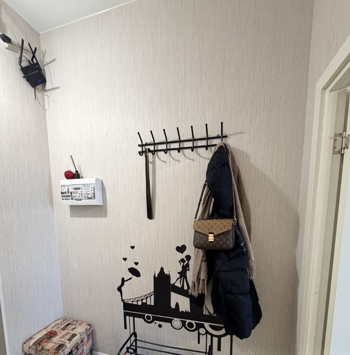Есть ручной пылесос с множеством насадок, вешалки для верхней одежды, обувница и место, чтобы присесть в коридоре.