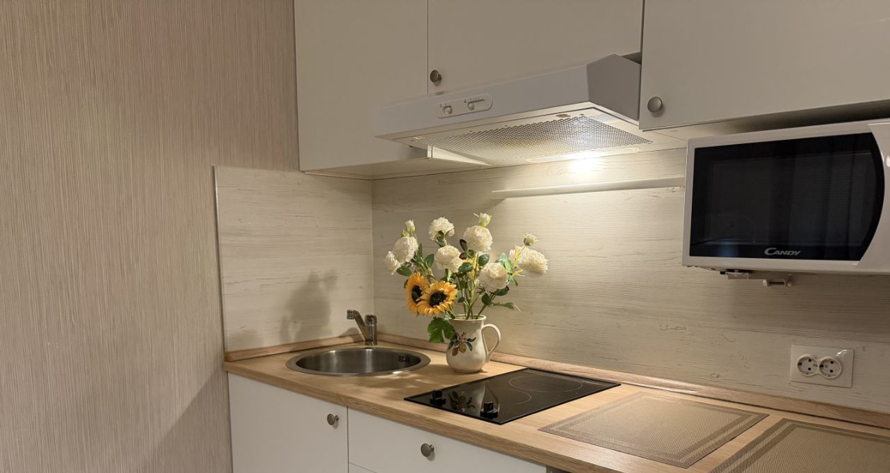 В квартире своя кухня для готовки и отдельная ванная комната (санузел с душем, раковиной, туалетом) стиральной машиной и феном + гигиенические средства и полотенца