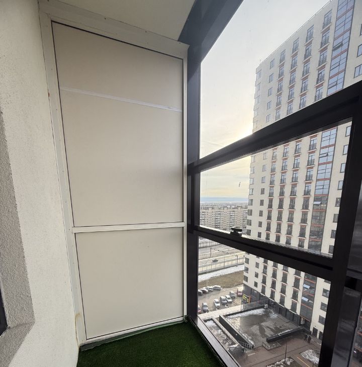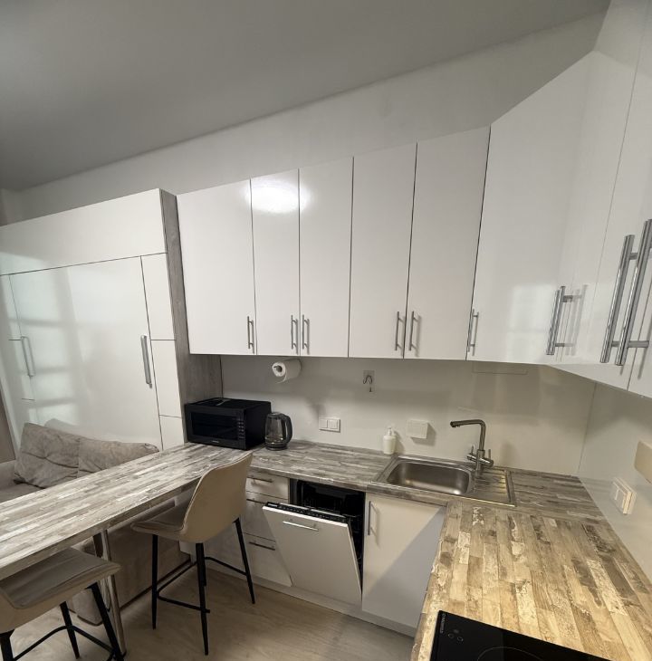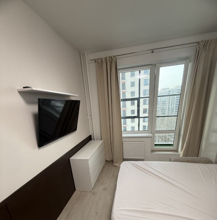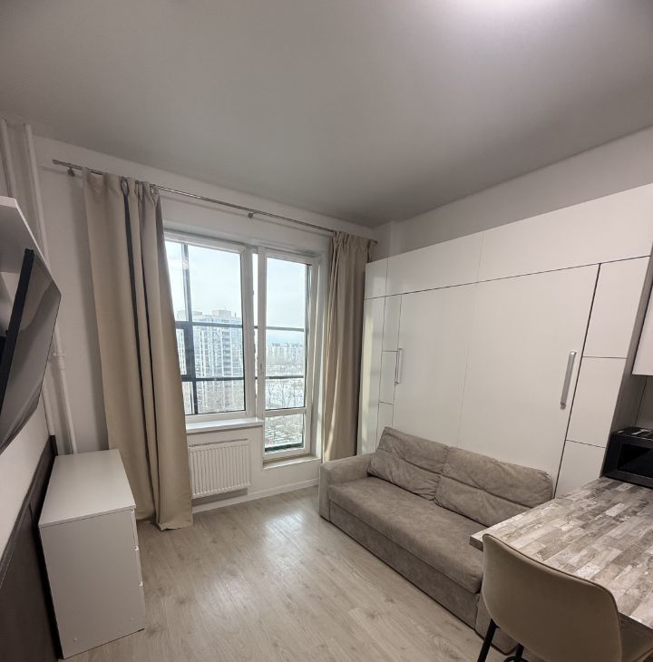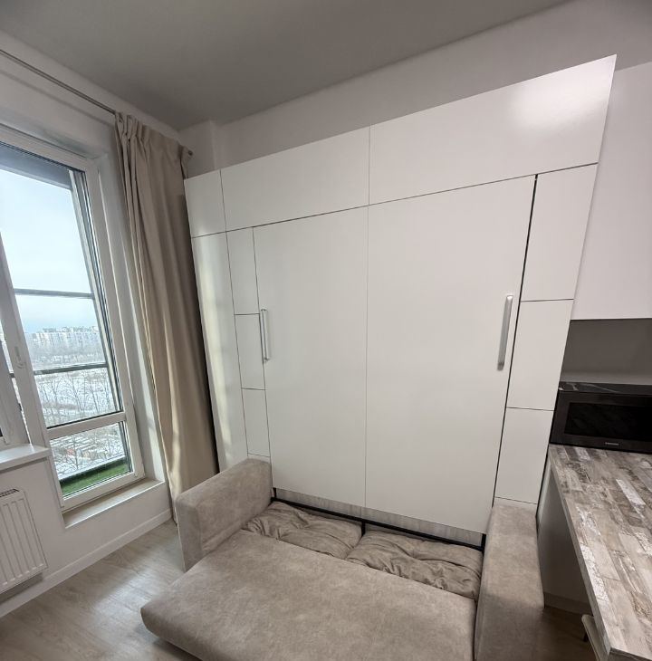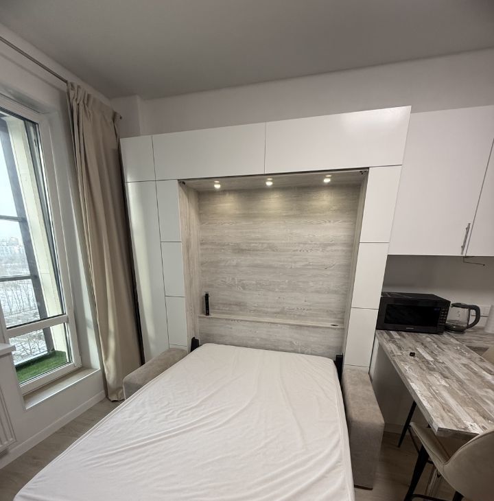 Квартира оборудована раскладывающейся кроватью/диваном из шкафа с большим количеством полок и подсветкой, просторная лоджия около 6 м², кухня с барной стойкой.