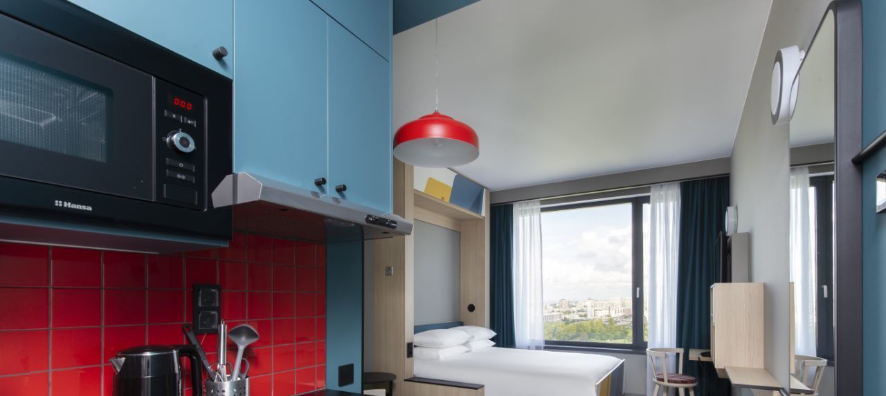 - функциональный кухонный блок: посуда на 2 персоны, бокалы, столовые приборы, индукционная варочная панель, мини-холодильник, микроволновая печь, электрический чайник