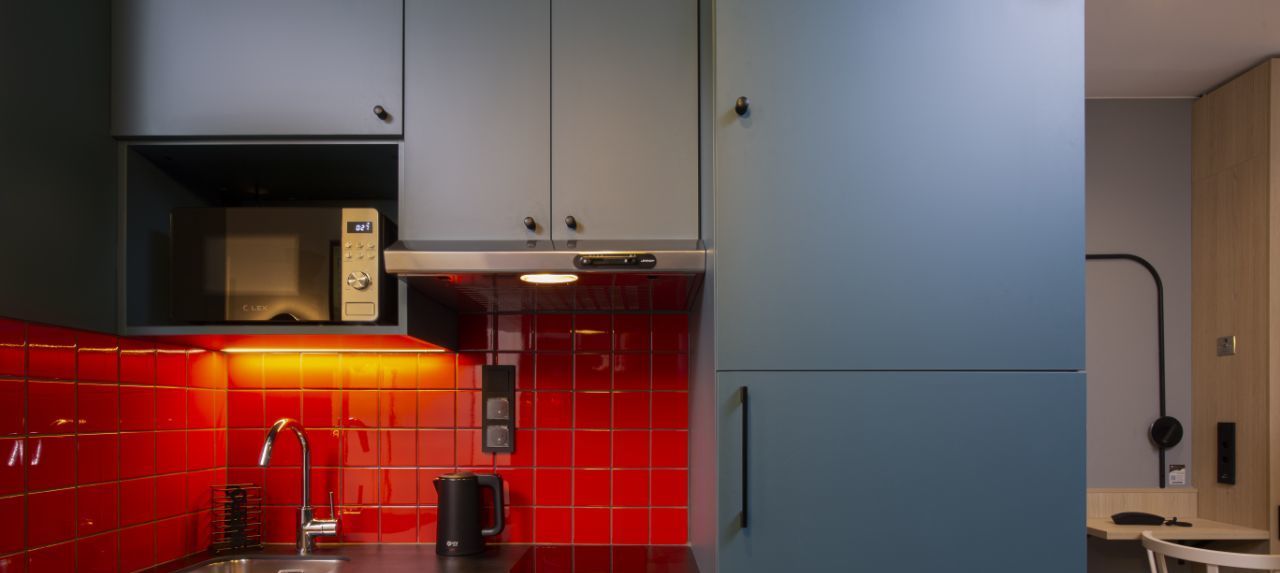 - функциональный кухонный блок: посуда на 2 персоны, бокалы, столовые приборы, индукционная варочная панель, большой холодильник, микроволновая печь, электрический чайник, посудомоечная машина