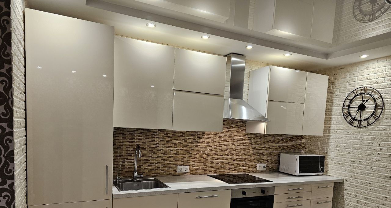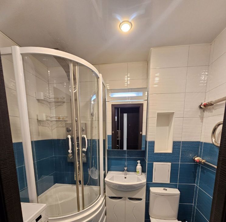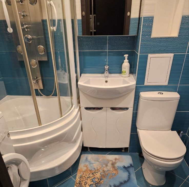 В квартире сделан качественный евроремонт, есть всё необходимое для комфортной жизни. Обстановка включает мебель на кухне и в комнате. Кухня и техника - Икея. Из техники доступны кондиционер, холодильник, посудомоечная машина, телевизор и стиральная машина. Санузел совмещённый, оборудован душевой кабиной и душевой панелью с гидромассажем. Сантехника AmPm.