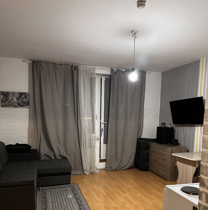 Студия полностью оборудована для жизни. Диван, холодильник, шкаф с зеркалом, комод, телевизор, стиральная машина. (все, что на фото)