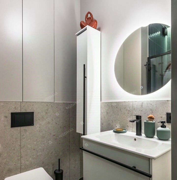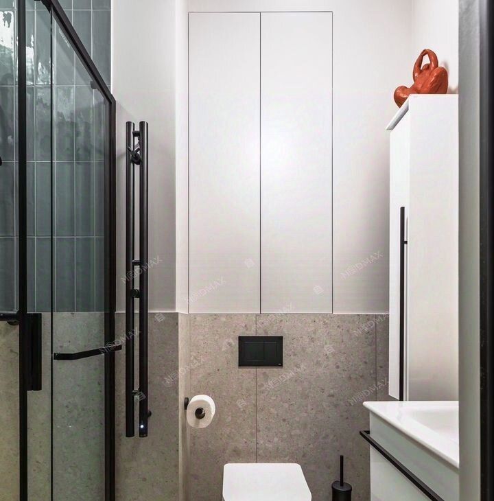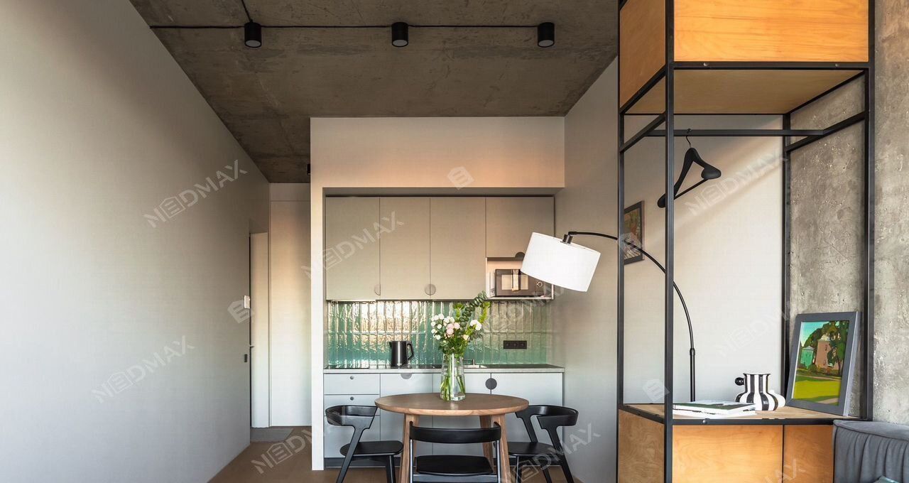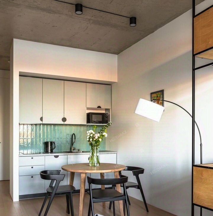 Практичная встроенная техника: мини-холодильник, посудомоечная машина, плита, вытяжка, стиральная машина, водонагреватель, ручной пылесос.