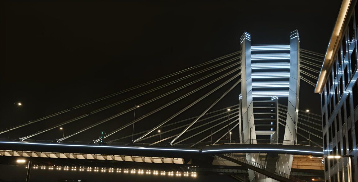 Вид не окна в окна, в сторону моста, очень эффектная подсветка ночью.