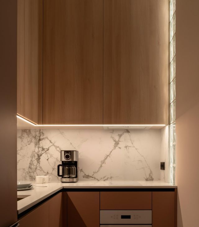 Полноценная кухонная зона - помимо посудомоечной машины и варочной поверхности оснащена духовкой и микроволновой печью. Есть кофеварка, большой встроенный холодильник. Стиральная машина с сушкой.