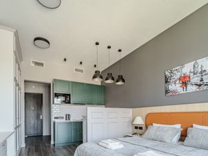 В зоне спальни- большая кровать с ортопедическим матрасом и подьемным механизмом, куда можно убрать сезонные вещи.