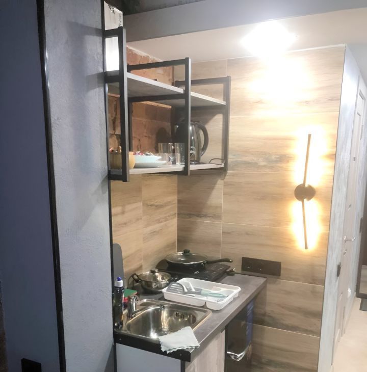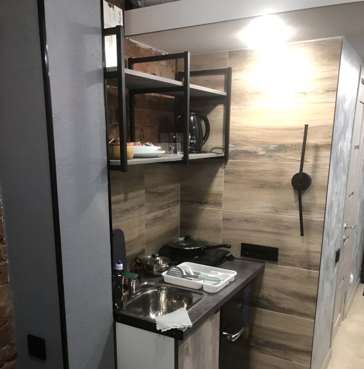 В студии есть все необходимое для жизни. Плита для готовки, чайник, столовые приборы. Стиральная машинка в общем коридоре.