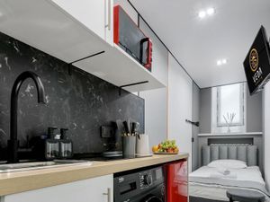Нa кухнe в вашем полном распоряжении стиральная машина, плита, чайник, холодильник, а также набор посуды и столовых приборов.