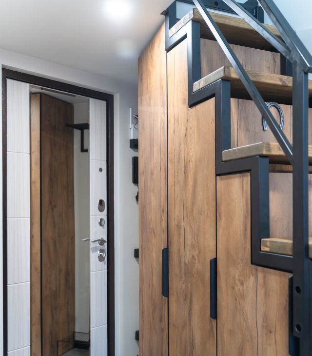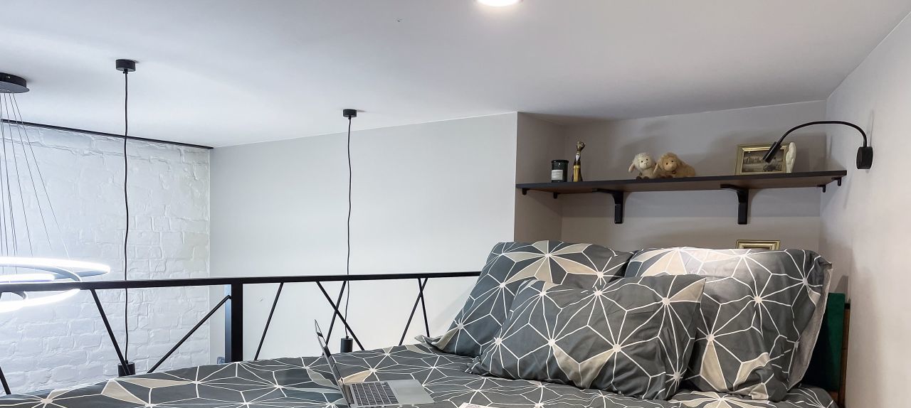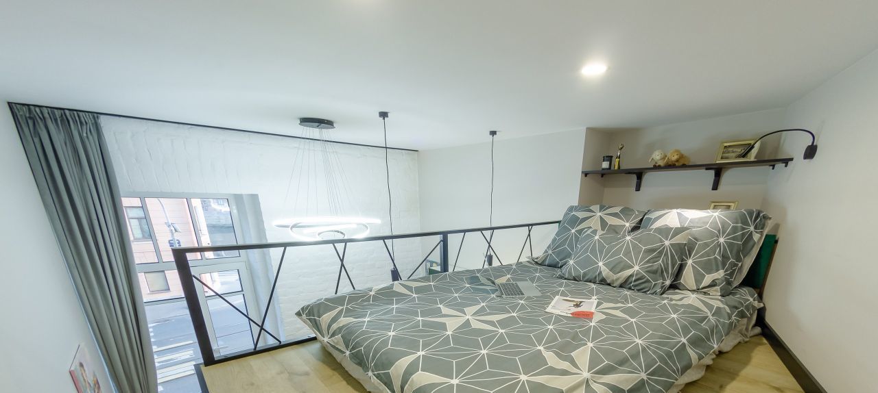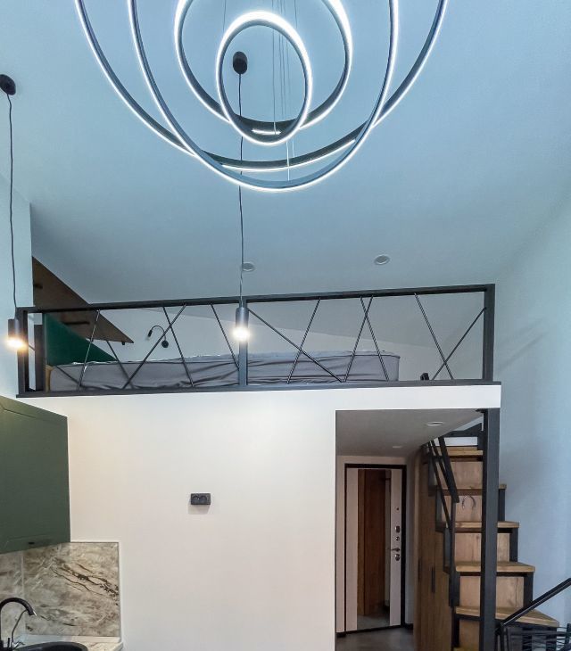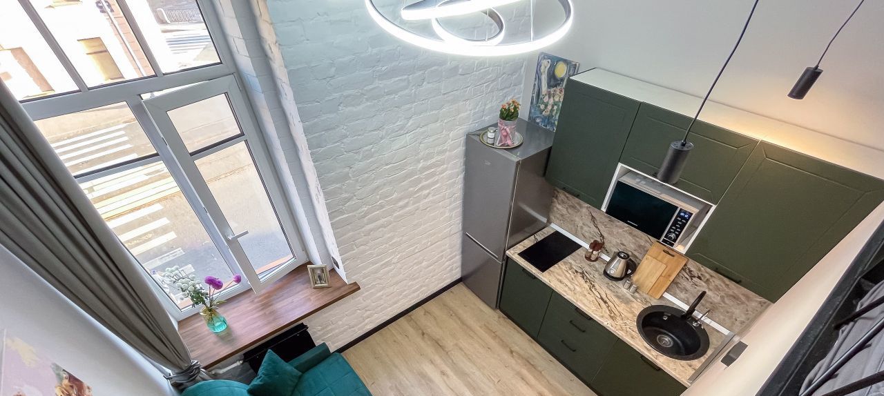 Высота потолков 3,7 метра. Два яруса. Верхний полноценная комфортабельная спальная зона. Площадь первого этажа 15 кв.м, второго 6 кв.м, общая площадь квартиры 21 кв.м.