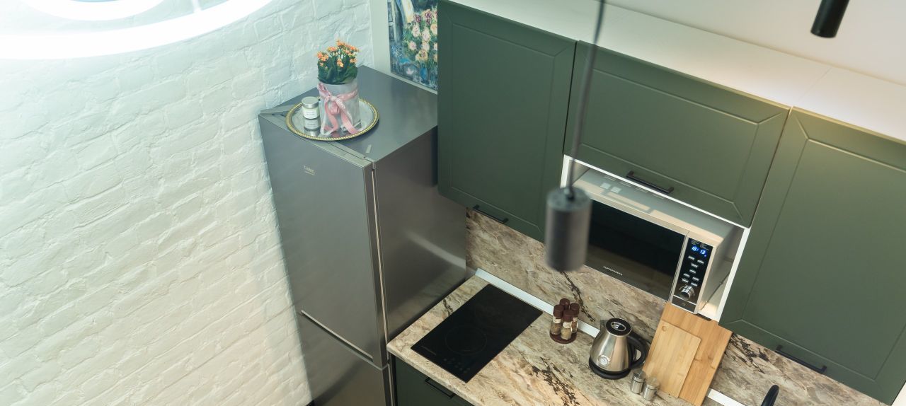 Ремонт исключительно из высококачественных дорогостоящих материалов. Новые! мебель и техника кухонный гарнитур, шкафы, комод, диван, холодильник, стиральная машина, электроплита, стационарная система очистки воды и т.д. Дизайн интерьера спроектирован в профессиональном исполнении - оба яруса Изумрудный стиль, санузел Блэк энд вайд в чёрно-белом стиле.