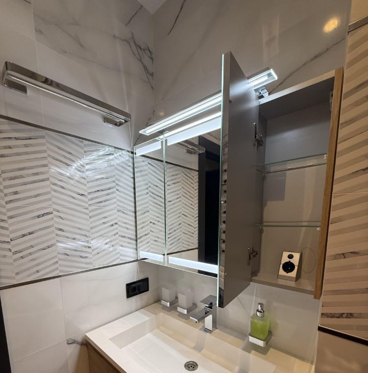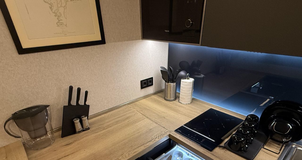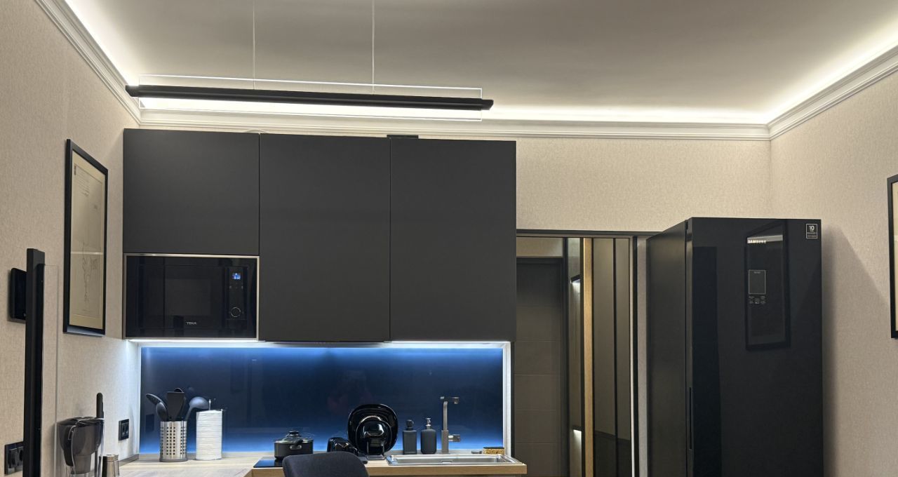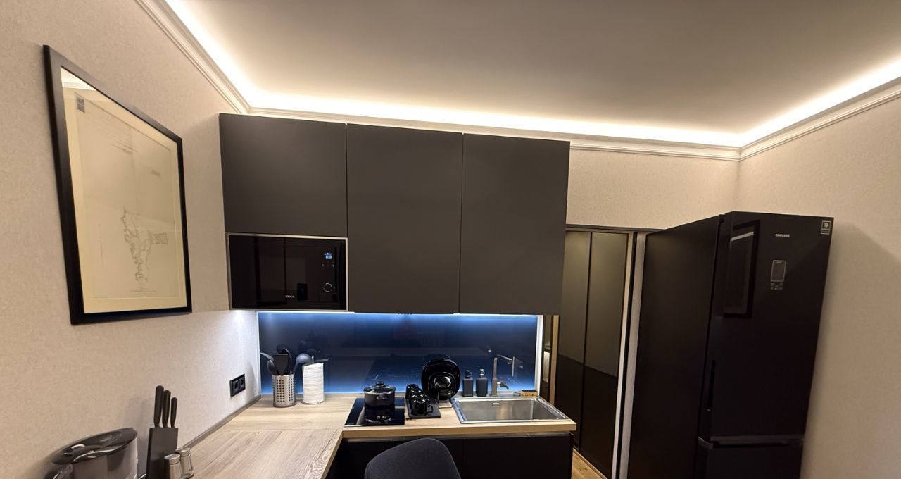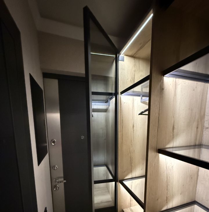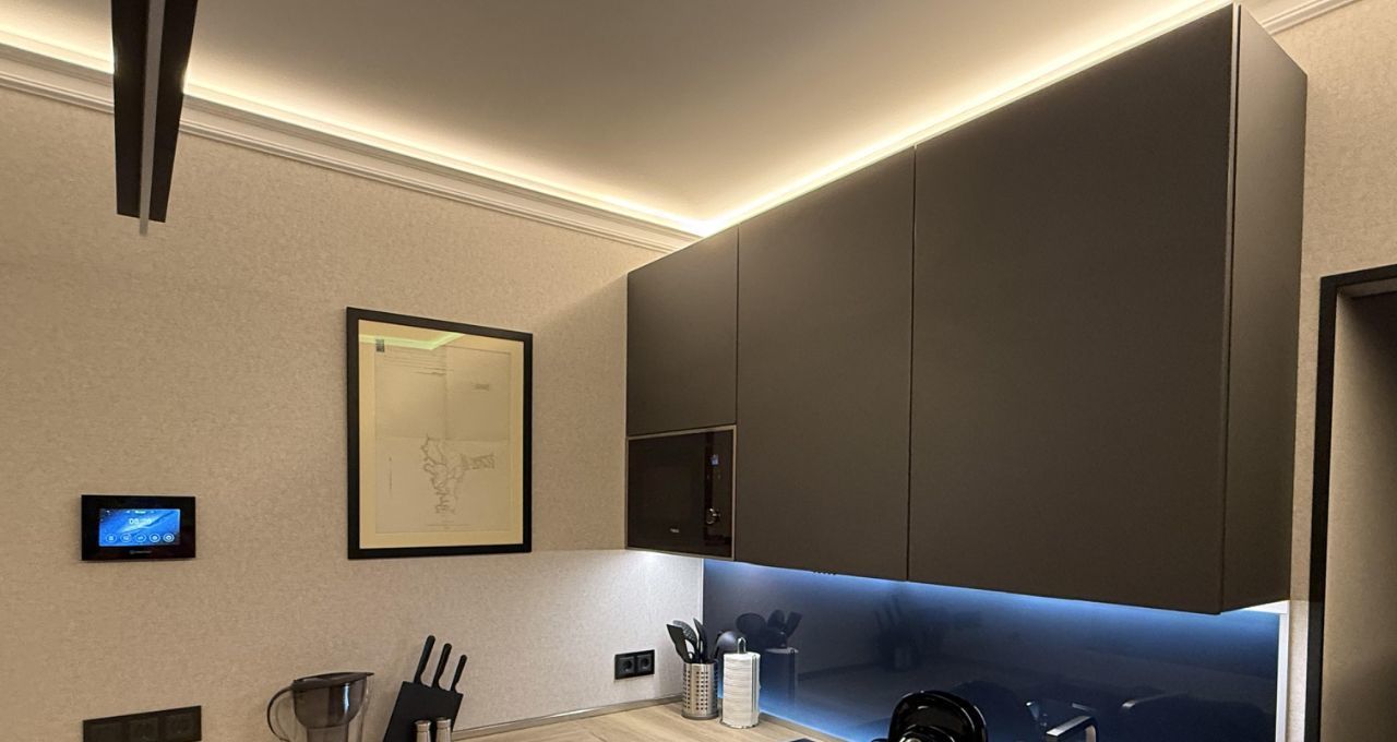 - кухня, все шкафы с подсветками (кнопка, пульт)- полки, ящики- включение при открывании