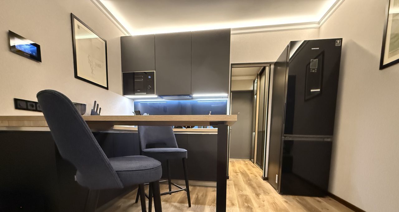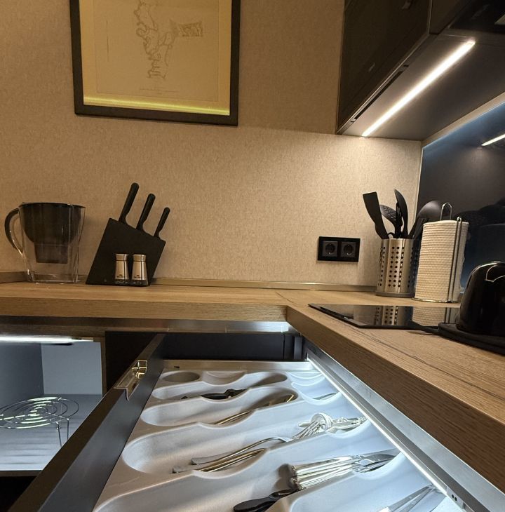 - вся мебель сделана на заказ; фасады МДФ, дорогая итальянская фурнитура, доводчики Blum;