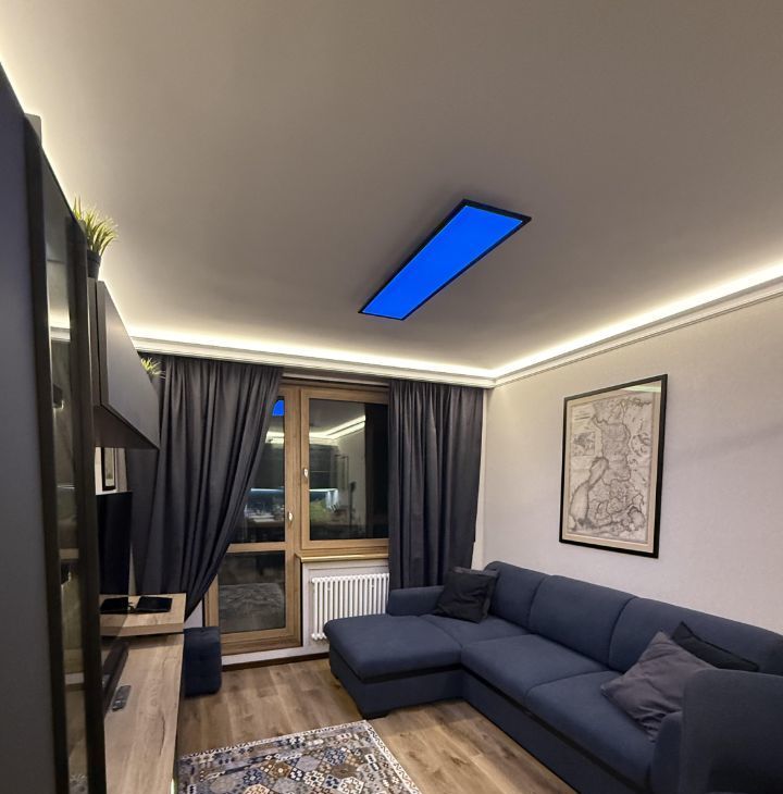 - в центре комнаты на потолке: лед панель 32000 цветов (пульт)- меняет цвета