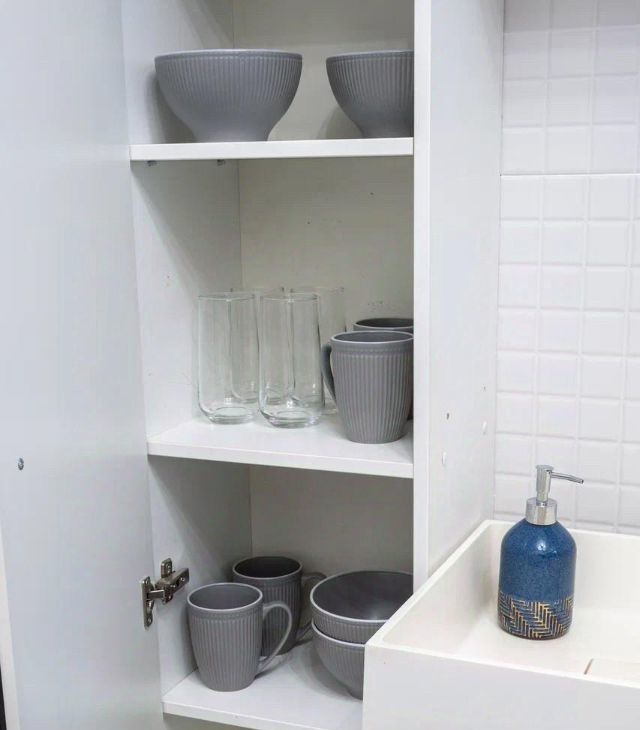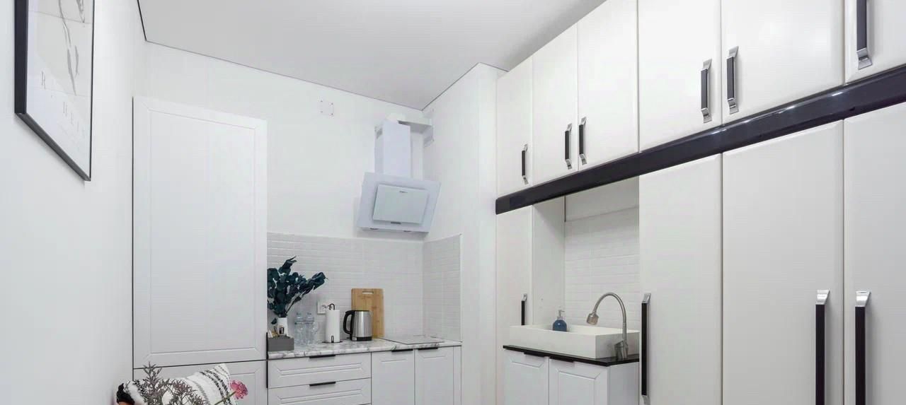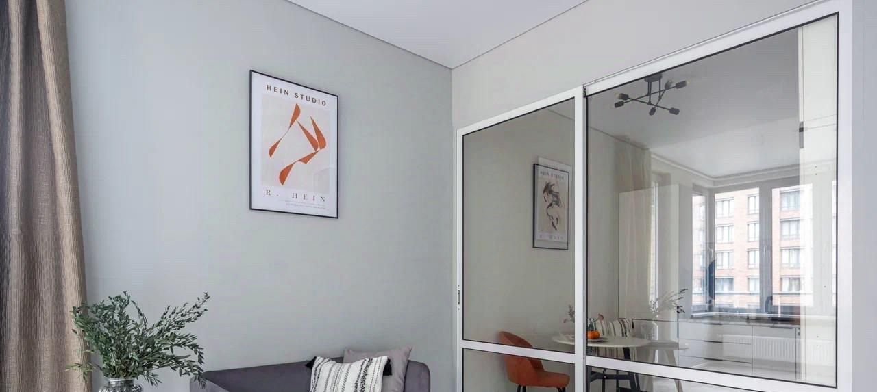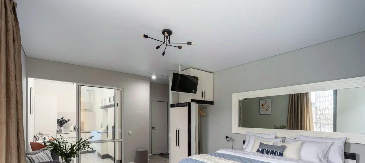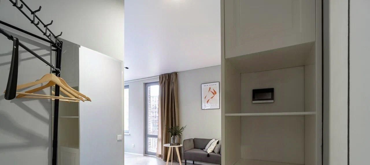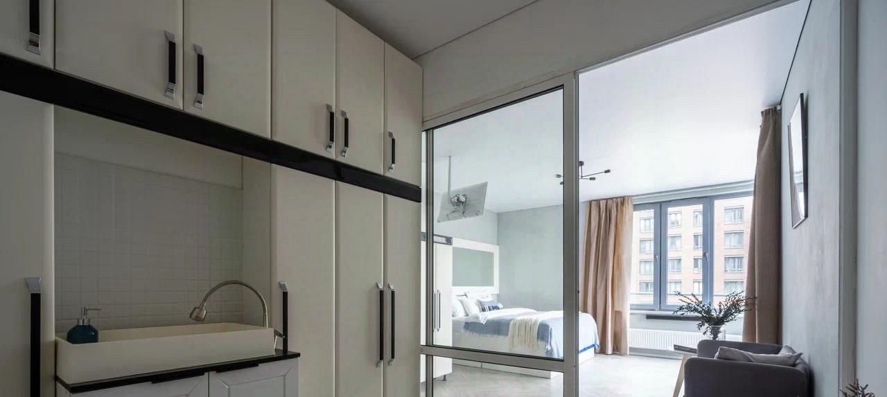 • кухонная зона отделена, поэтому пространство ощущается как полноценная квартира, а не стандартная студия.