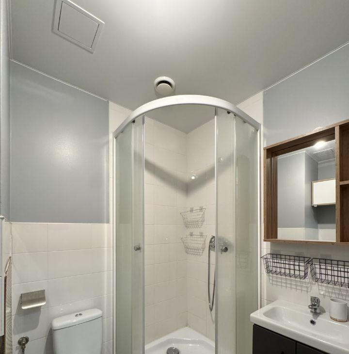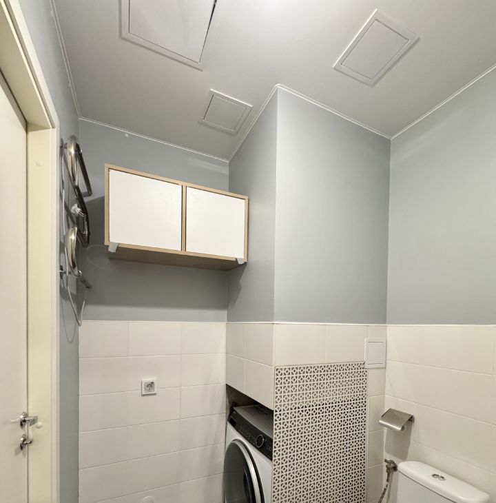 - Совмещенный санузел с душевым уголком (3.0 м²), в котором свободно размещается стиральная машина, также есть электрический полотенцесушитель,