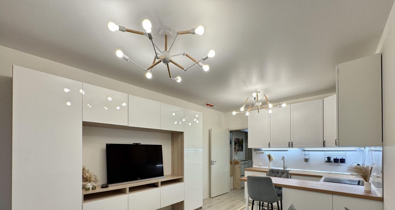 - Просторная комната прямоугольной формы (16.7 м²), которая удачно разделена на кухонную зону с полноценным кухонным гарнитуром, изготовленным на заказ, и спальную зону. Кухонный гарнитур оснащён встроенным холодильником, варочной панелью, духовым шкафом, вытяжкой - Вы сможете готовить без ограничений.