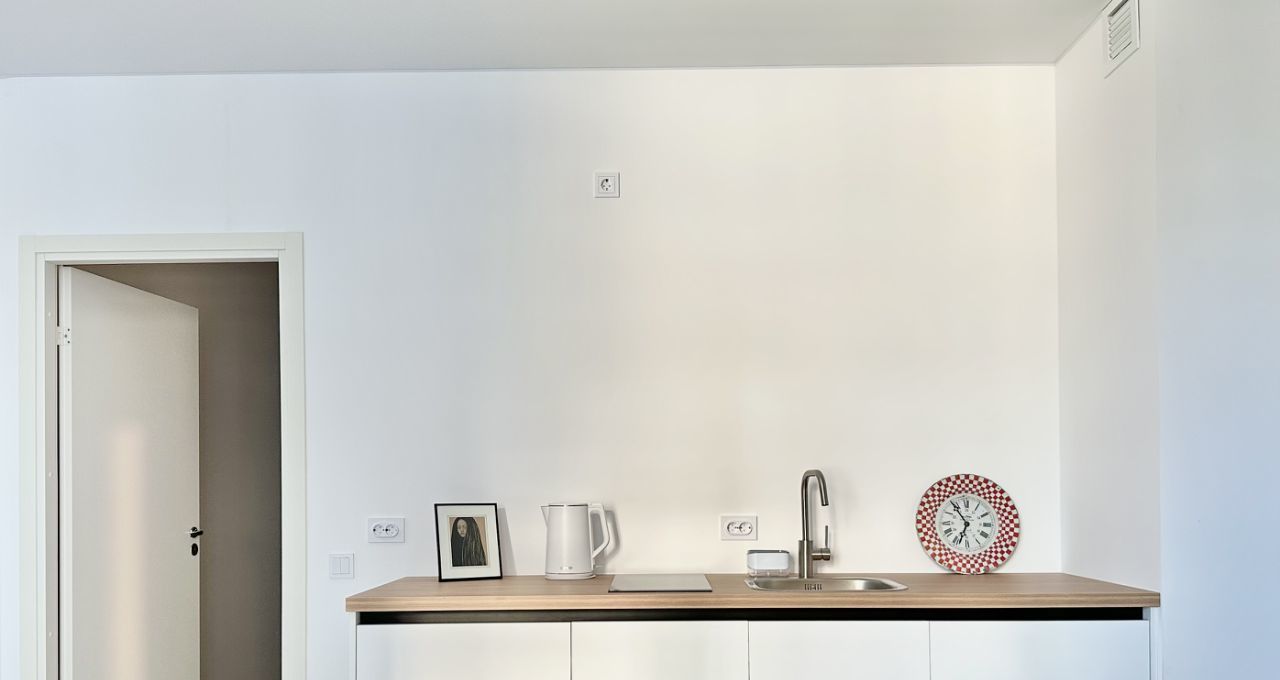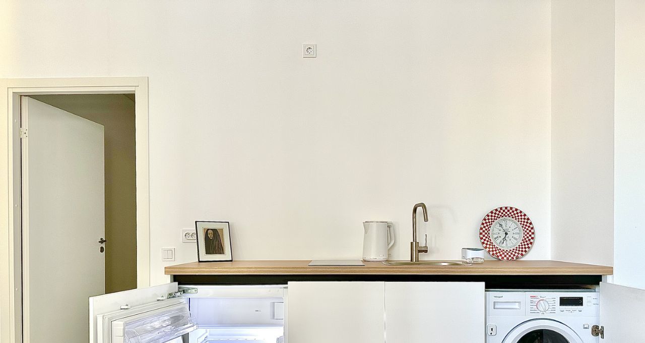 Техника: встроенные холодильник, варочная панель и стиральная машина; чайник, Wi-Fi.