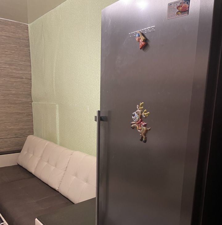 Белый холодильник заменен на большой современный холодильник стального цвета.