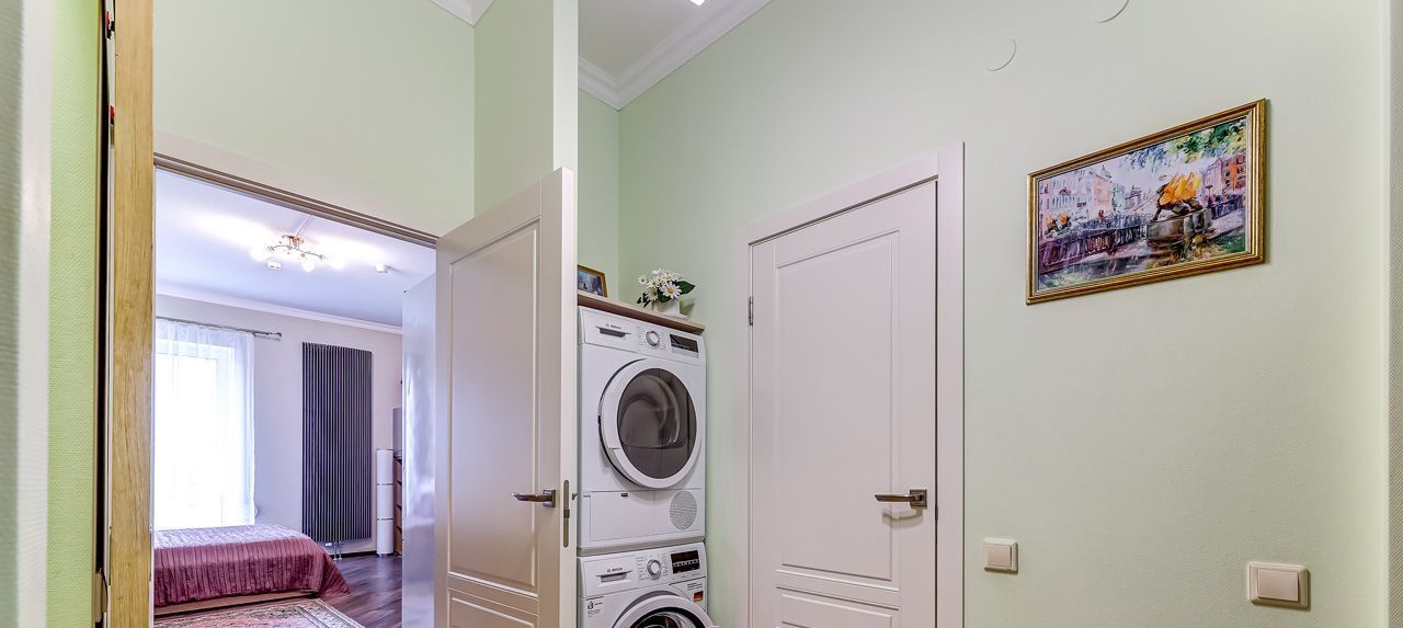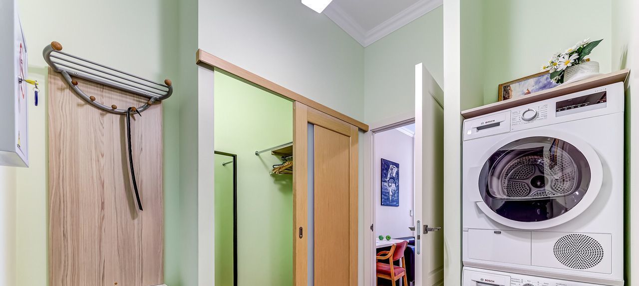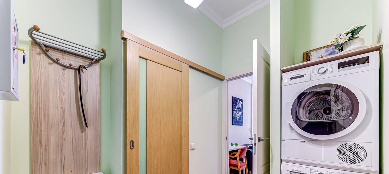 Полностью оборудована и меблирована. Есть стиральная и сушильная машина, стационарный фильтр для приготовления воды питьевого качества, гладильная доска, утюг, пылесос.
