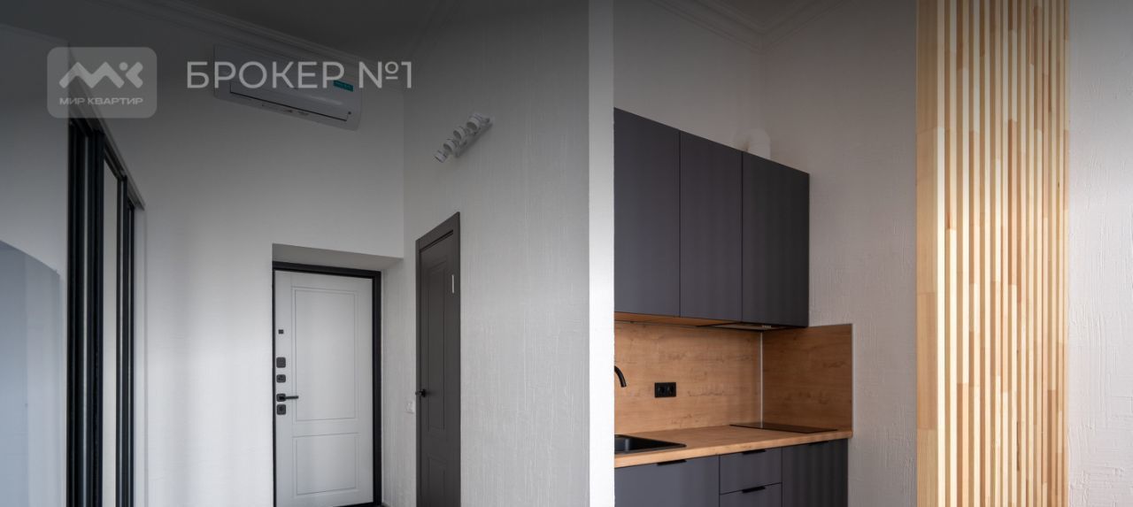 Авторский дизайн: Высокий потолок создает ощущение простора и свободы. Пространство грамотно зонировано с помощью деревянных реек, элегантно отделяя спальную зону от гостиной-кухни. Это модно, эстетично и функционально.