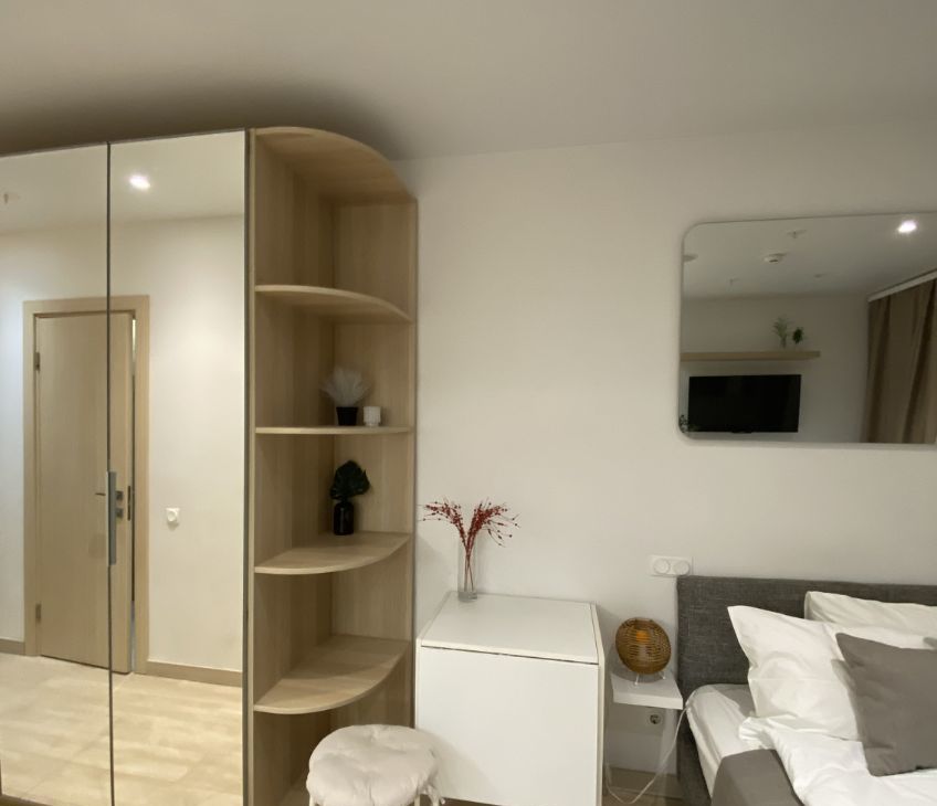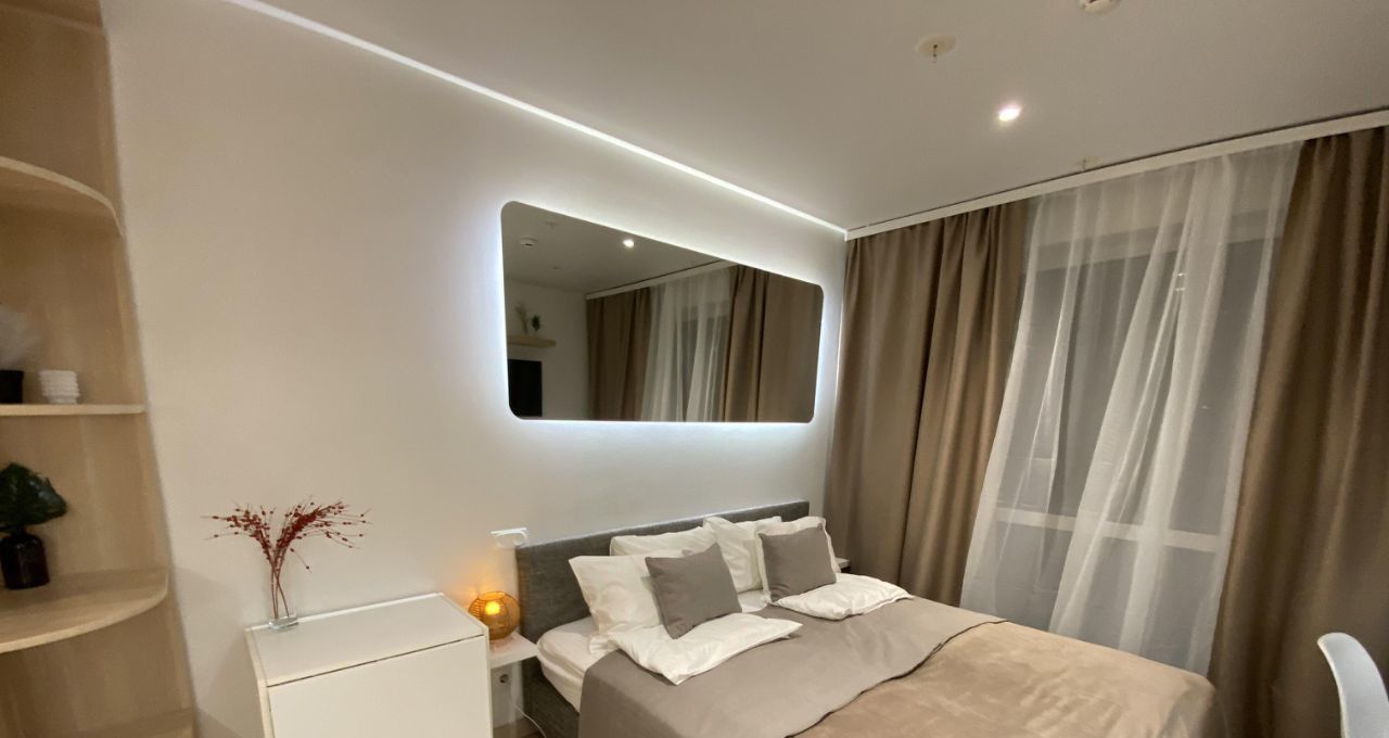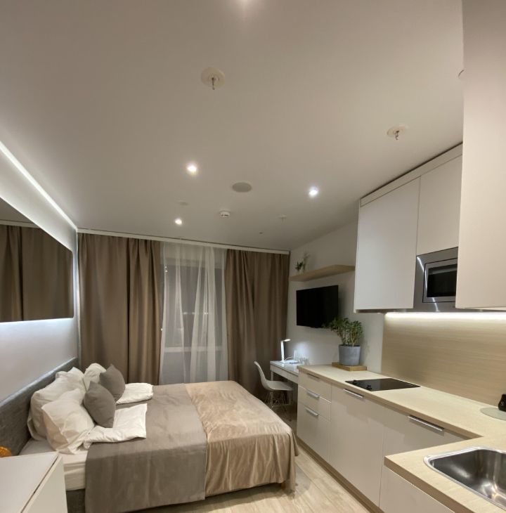 Студия с кроватью. Возможен вариант установки двуспальной кровати шириной 180 см или двух шириной по 90 см. Полная укомплектовка квартиры мебелью, техникой, текстилем, инвентарем. Шторы блэкаут, ортопедические матрасы, стиральная машина, встроенная техника. Отличные оценки от арендаторов с площадок предоставлю по запросу. Квартира очень тихая, подходит для проживания с ребенком.
