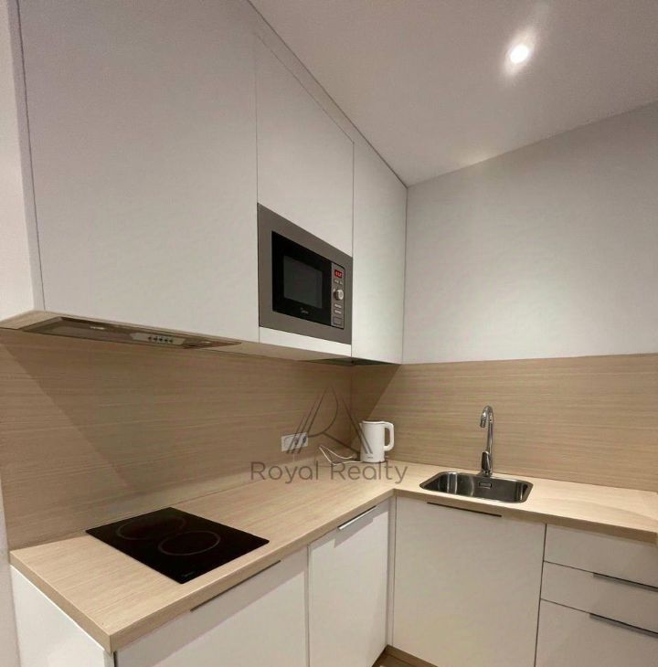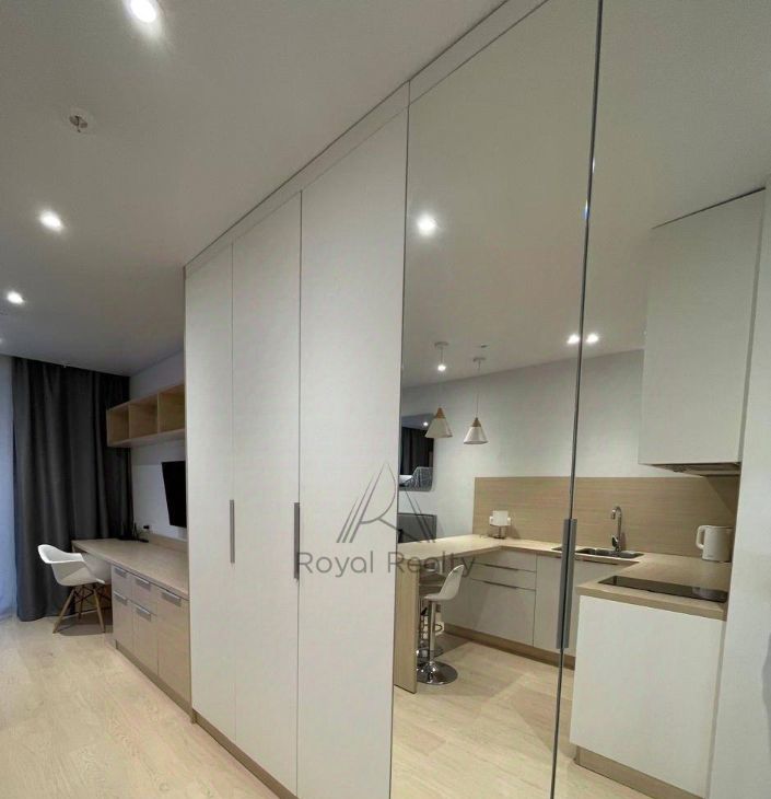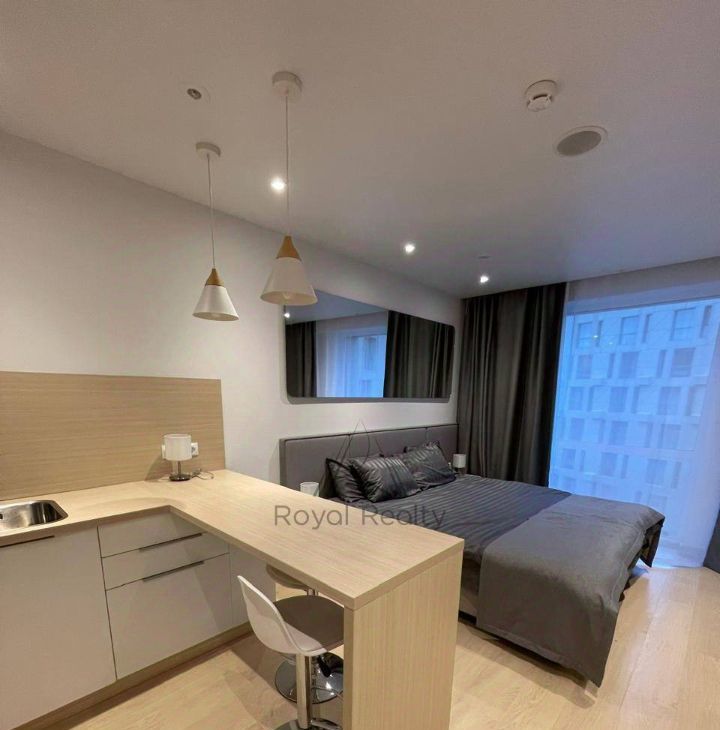 Светлая, просторная студия на 8 этаже современного комплекса. Окна во внутренний двор без машин — тихо и комфортно.