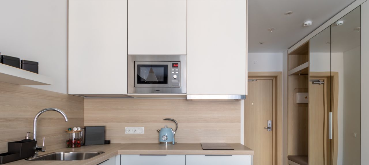 Полностью оборудованная кухня: Готовьте любимые блюда с помощью всей необходимой техники (холодильник, варочная панель, СВЧ, чайник) и посуды.