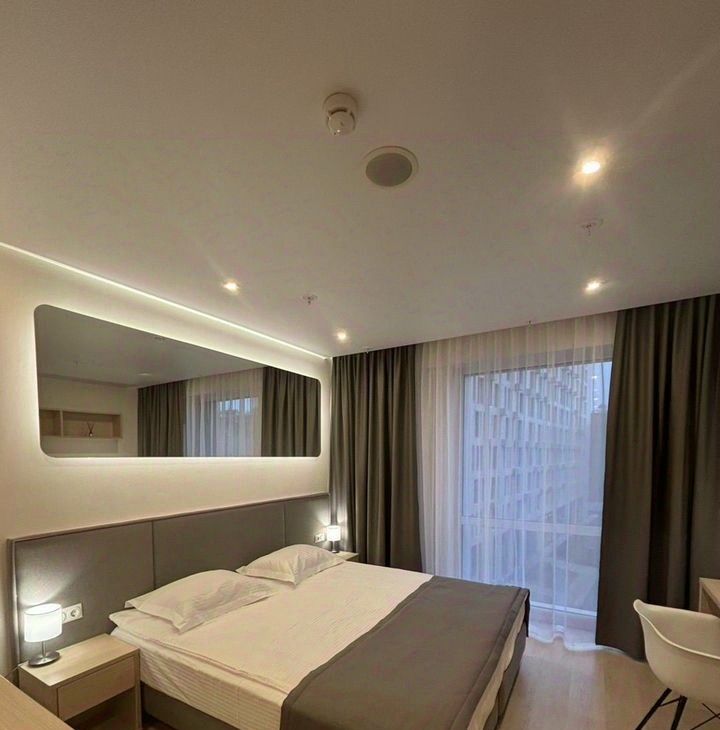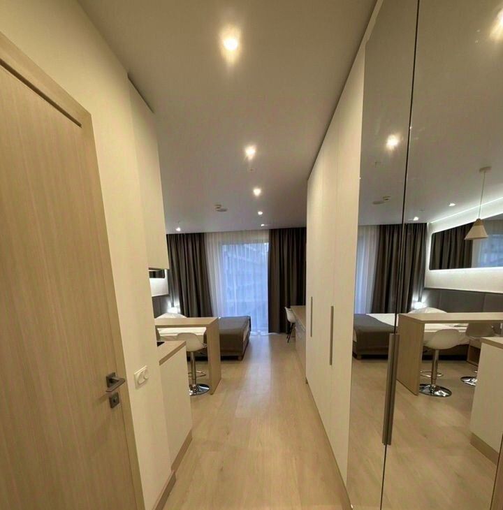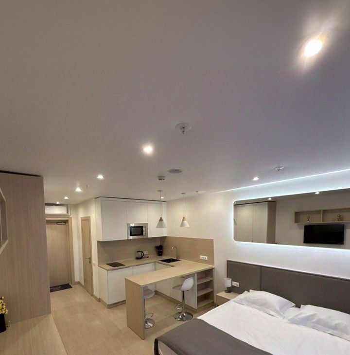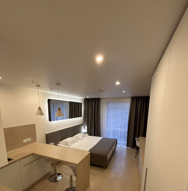 Сдается стильная квартира-студия с современным ремонтом на длительный срок. Залог составляет 20000 рублей. Коммунальные услуги оплачиваются арендатором по счетчикам. Разрешено проживание с детьми и животными. Квартира расположена на 4 этаже монолитно-кирпичного дома, построенного в 2017 году. В доме есть четыре пассажирских лифта. Просторная жилая зона площадью 20 м² включает в себя уютную спальню с двуспальной кроватью и вместительным шкафом, а также функциональную кухню с современной бытовой техникой, включая холодильник и микроволновую печь. Ванная комната совмещенная, оформлена в современном стиле с качественной сантехникой. В квартире установлен кондиционер, что обеспечивает комфортный климат в любое время года. Парковка открытая во дворе, что удобно для владельцев автомобилей. В шаговой доступности находятся все необходимые объекты инфраструктуры.