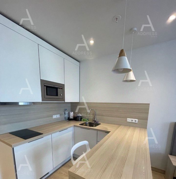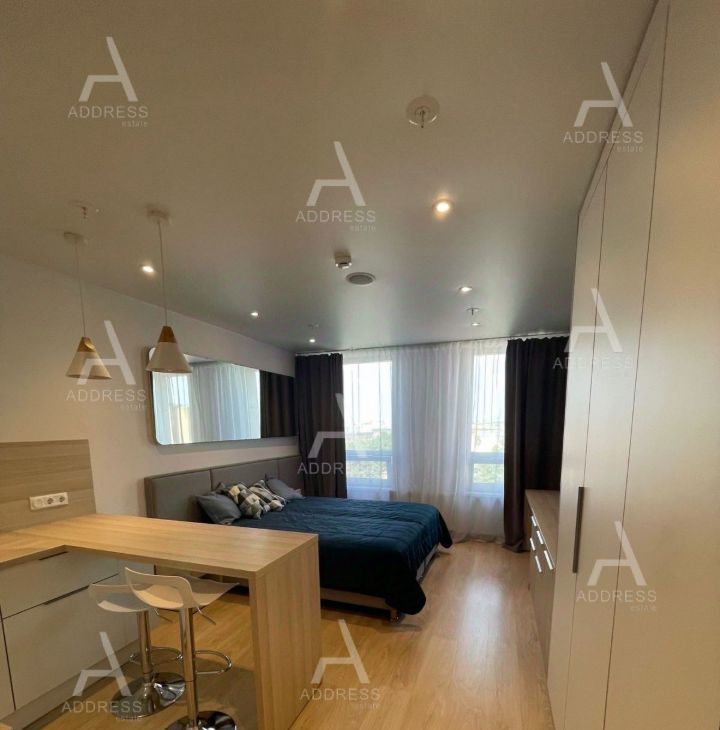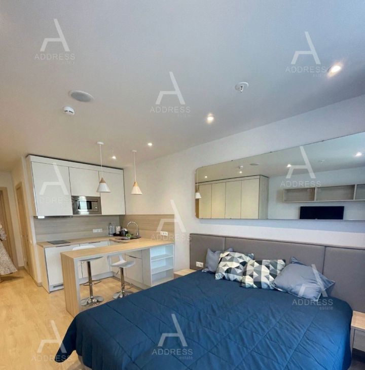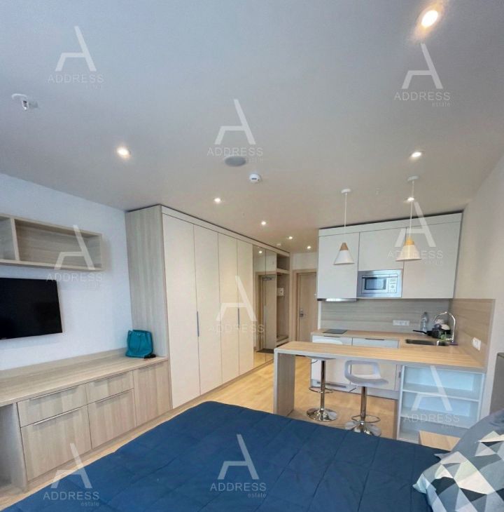 Студия укомплектована всей мебелью и бытовой техникой, встроенная кухня.