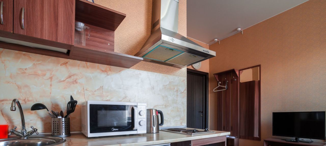 - Кухонная зона с посудой, принадлежностями для готовки и необходимой техникой: чайник, холодильник, микроволновка