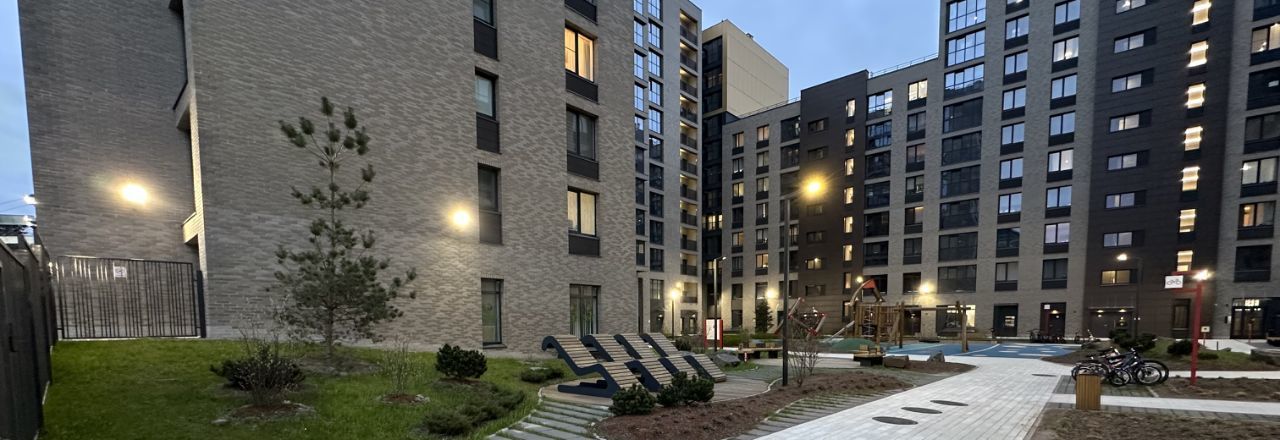 Сам дом расположен в шаговой доступности от ухоженного парка с подсветкой по вечерам и позволяет планировать полноценные прогулки на свежем воздухе среди взрослых деревьев, кустов и белочек.