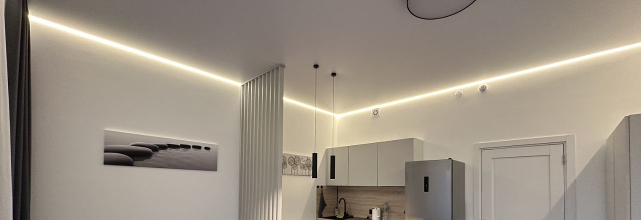 Комната зонирована разнообразной подсветкой и имеет большое количество мебели для хранения белья. Высота потолков 3,05 м, что создает квартире простор.