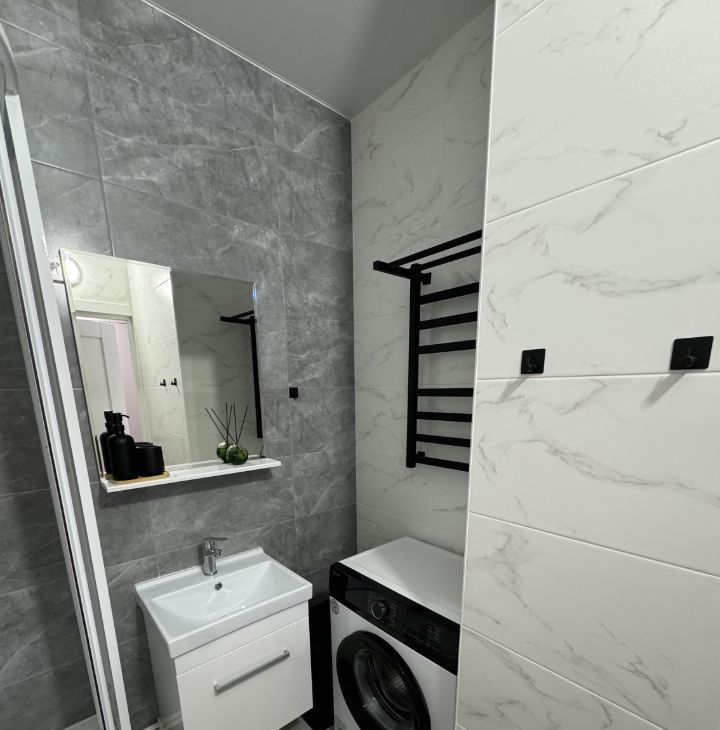 Квартира полностью готова для комфортного проживания. Внутри выполнен современный ремонт. Студия оборудована всей необходимой техникой: холодильником, посудомоечной машиной и телевизором, варочной панелью, микроволновкой, чайником, утюгом, стиральной машиной. Санузел совмещенный, оборудован душевой кабиной.