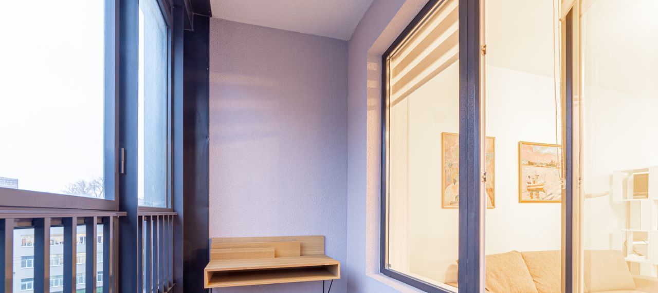 Жилая часть с диваном-кроватью, здесь же установлен рабочий стол, телевизор, а также вместительный шкаф и стеллаж. Рядом выход на просторный балкон с дополнительным столом.